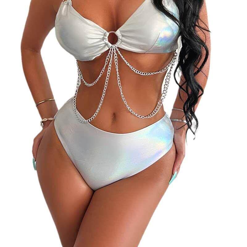 Купальник, металлическая ткань, цепь, костюм, европейский стиль, с открытой спиной