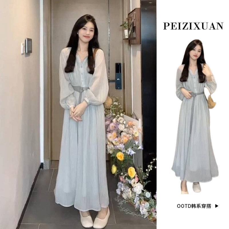 Синий лонгслив, осеннее платье, приталенный корсет, длинная юбка, французский стиль, подходит для подростков