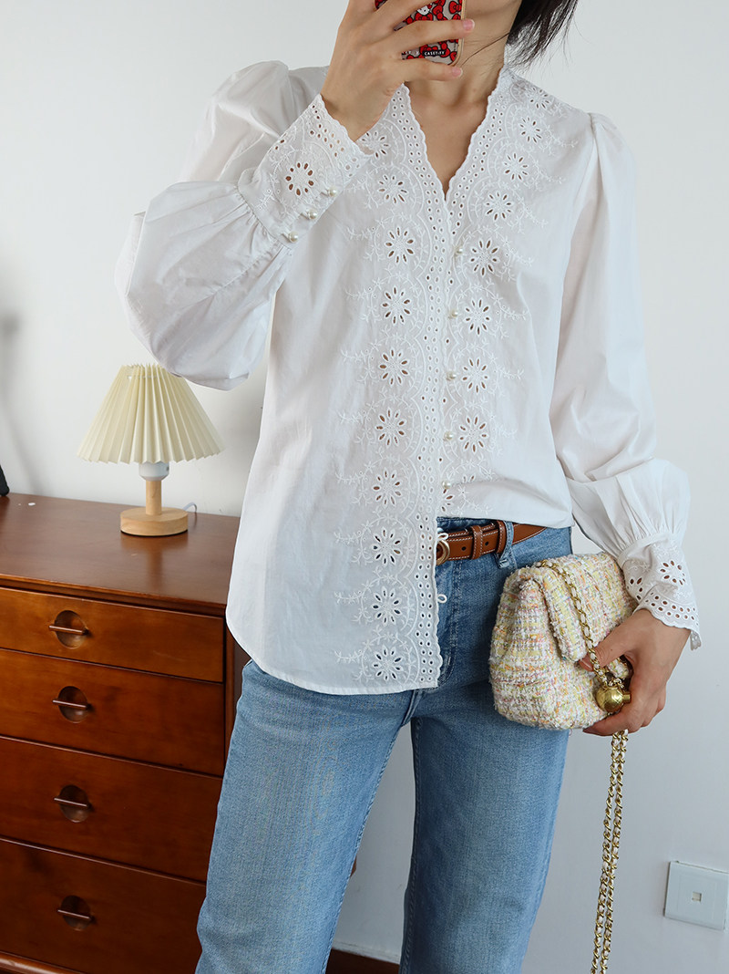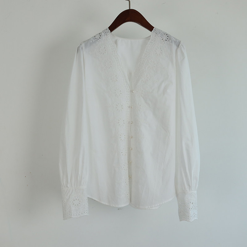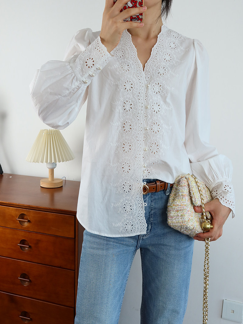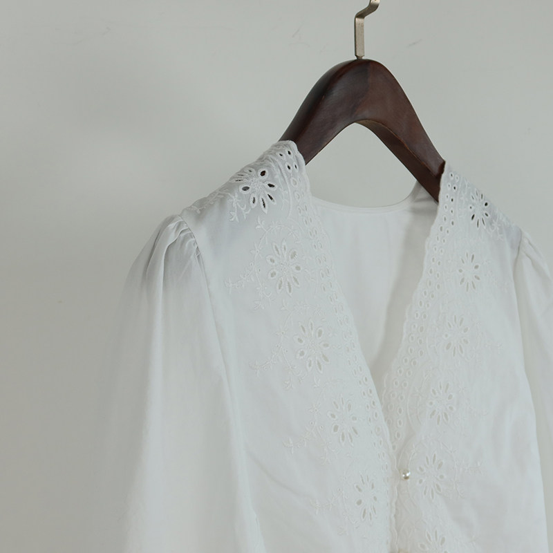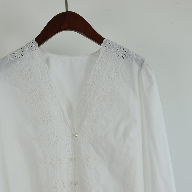 Ретро фонарь, рубашка, французский ретро стиль, с вышивкой, V-образный вырез