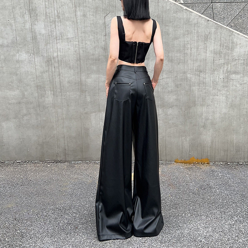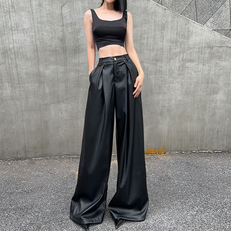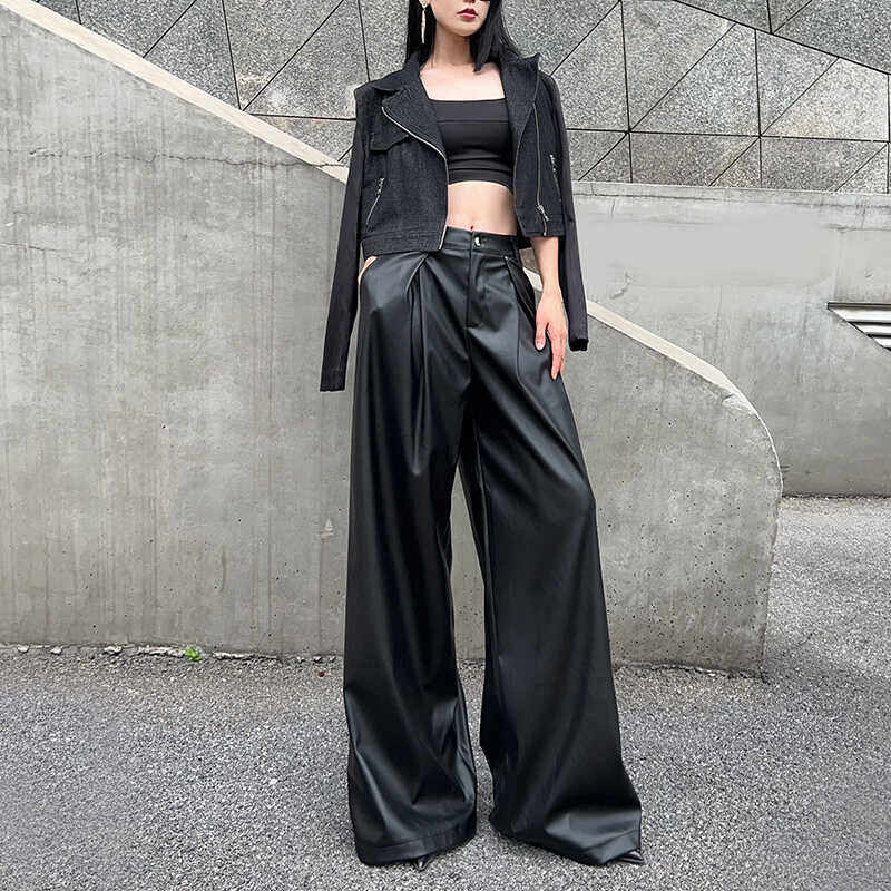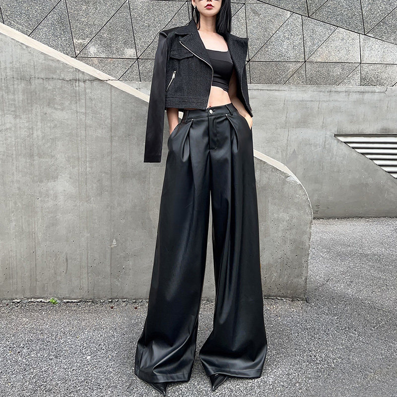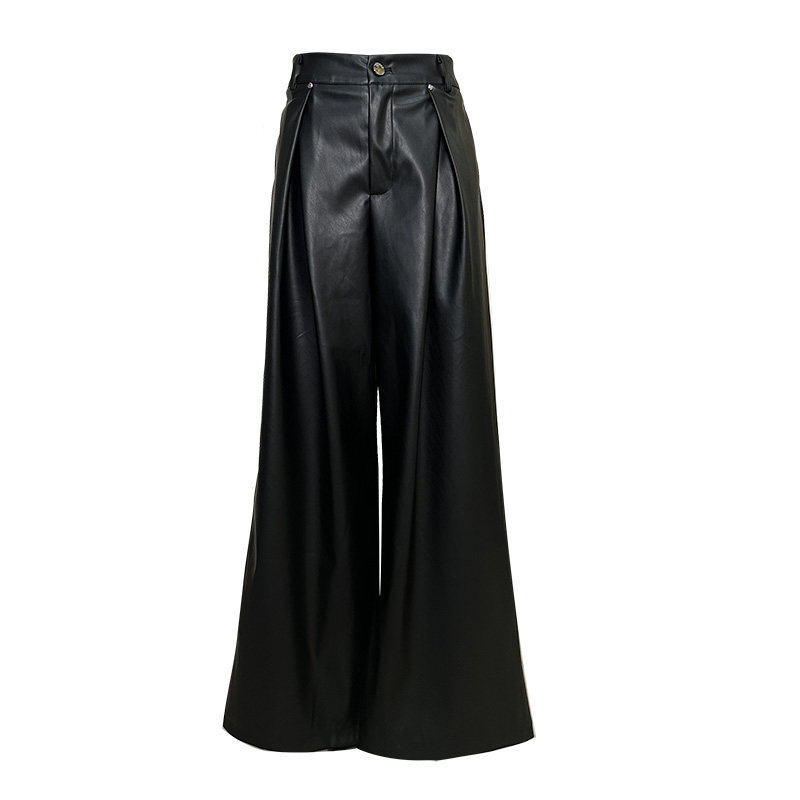 Черные осенние мягкие полиуретановые штаны, изысканный стиль, оверсайз, свободный прямой крой