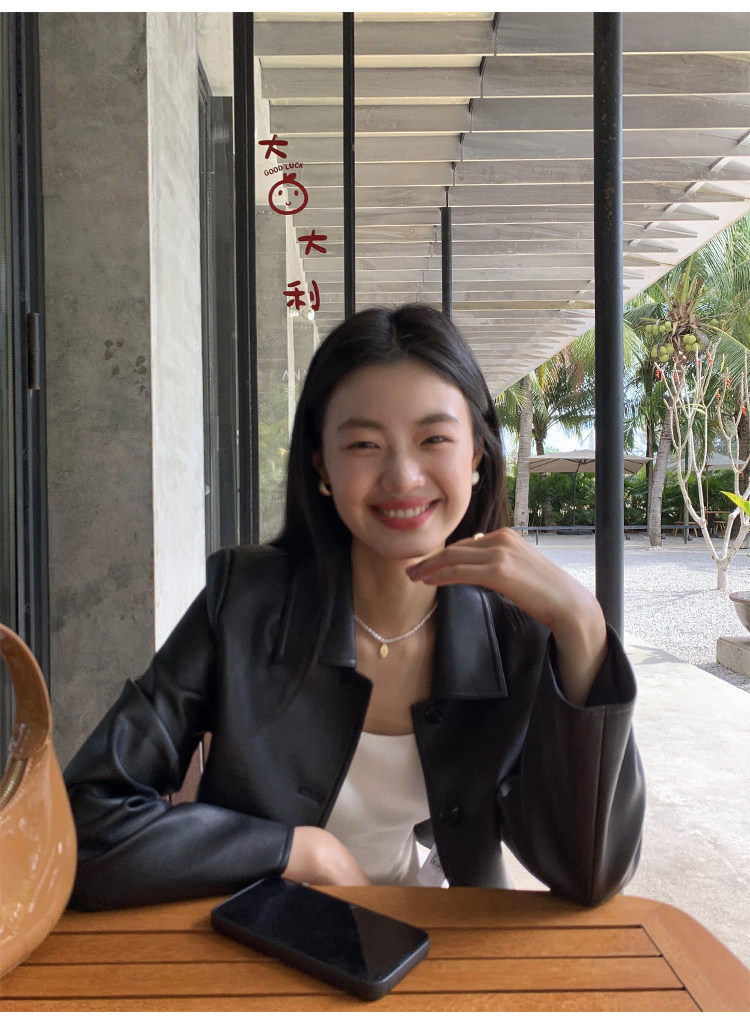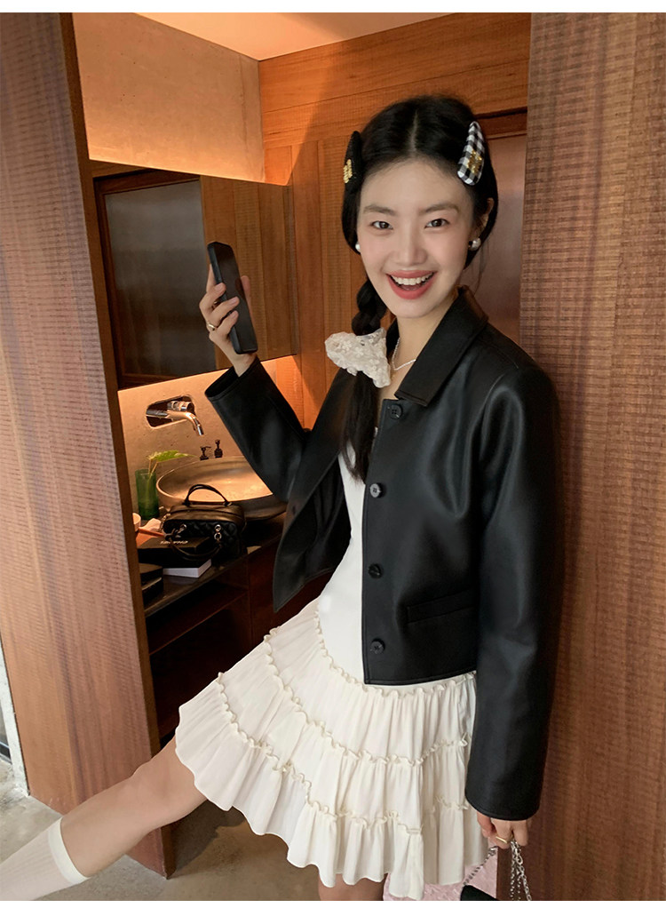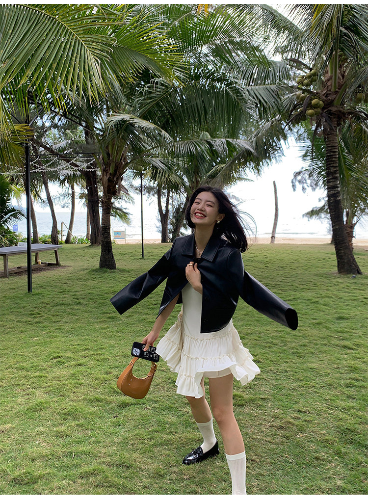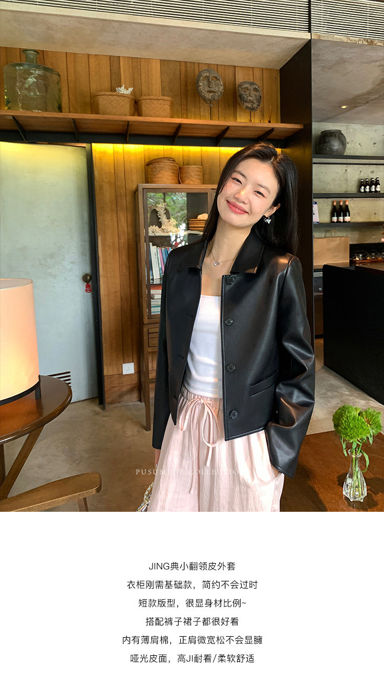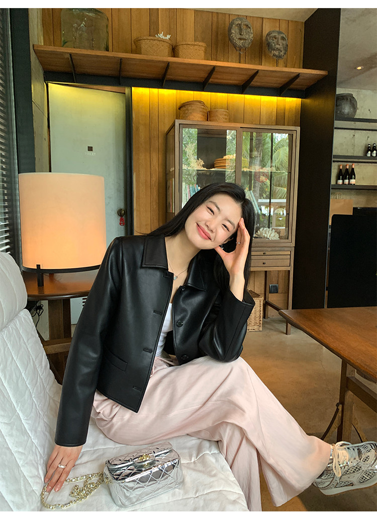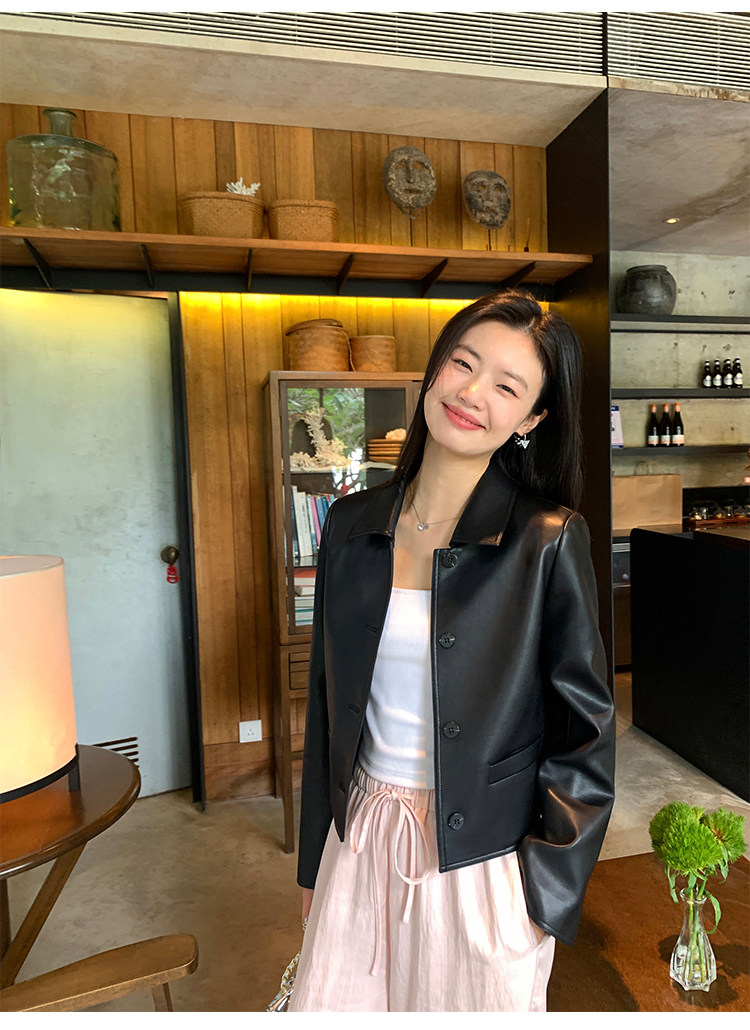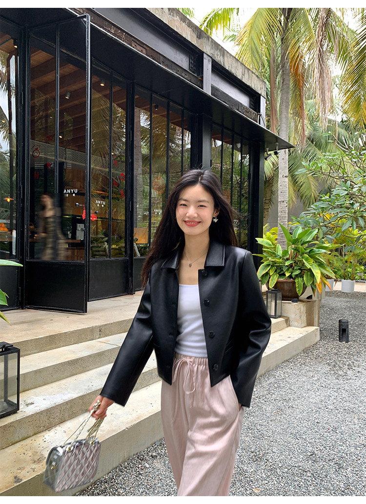 pusumede Черная полиуретановая осенняя короткая куртка, городской стиль