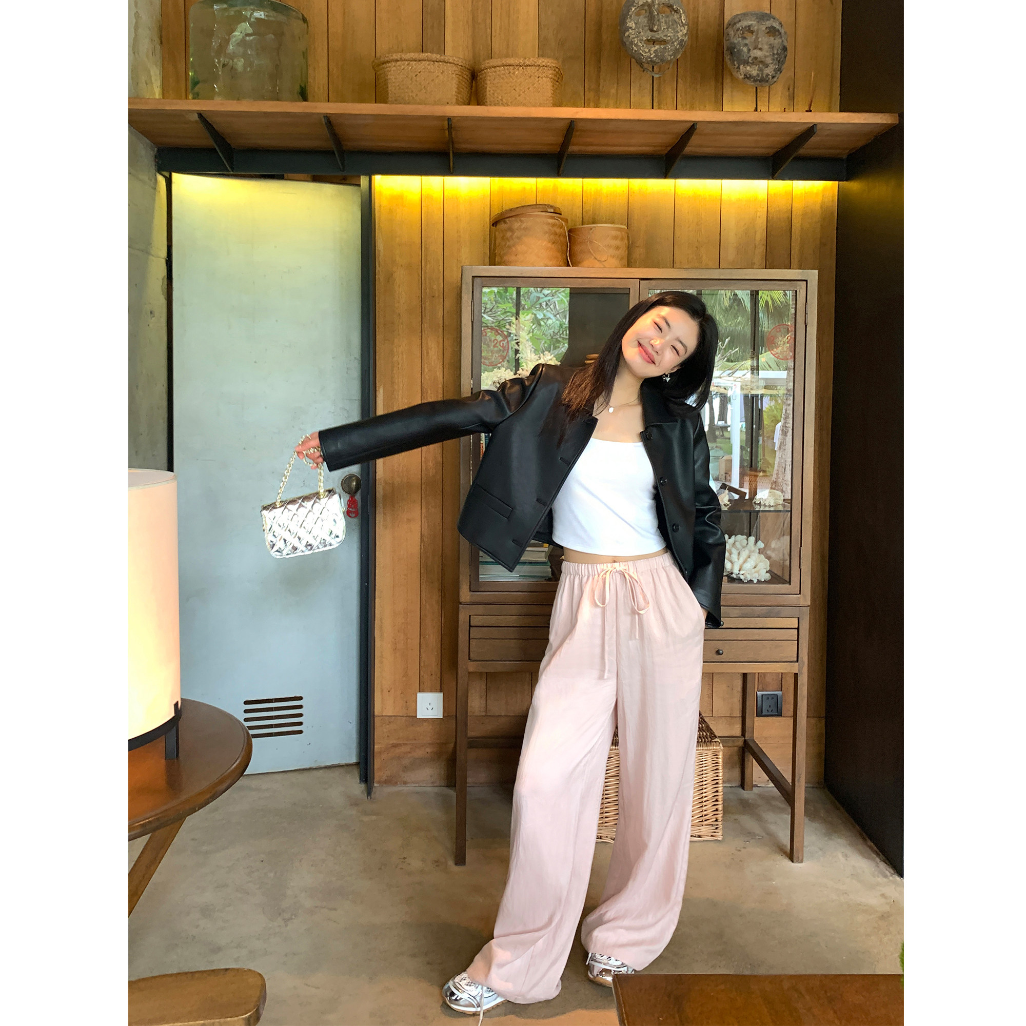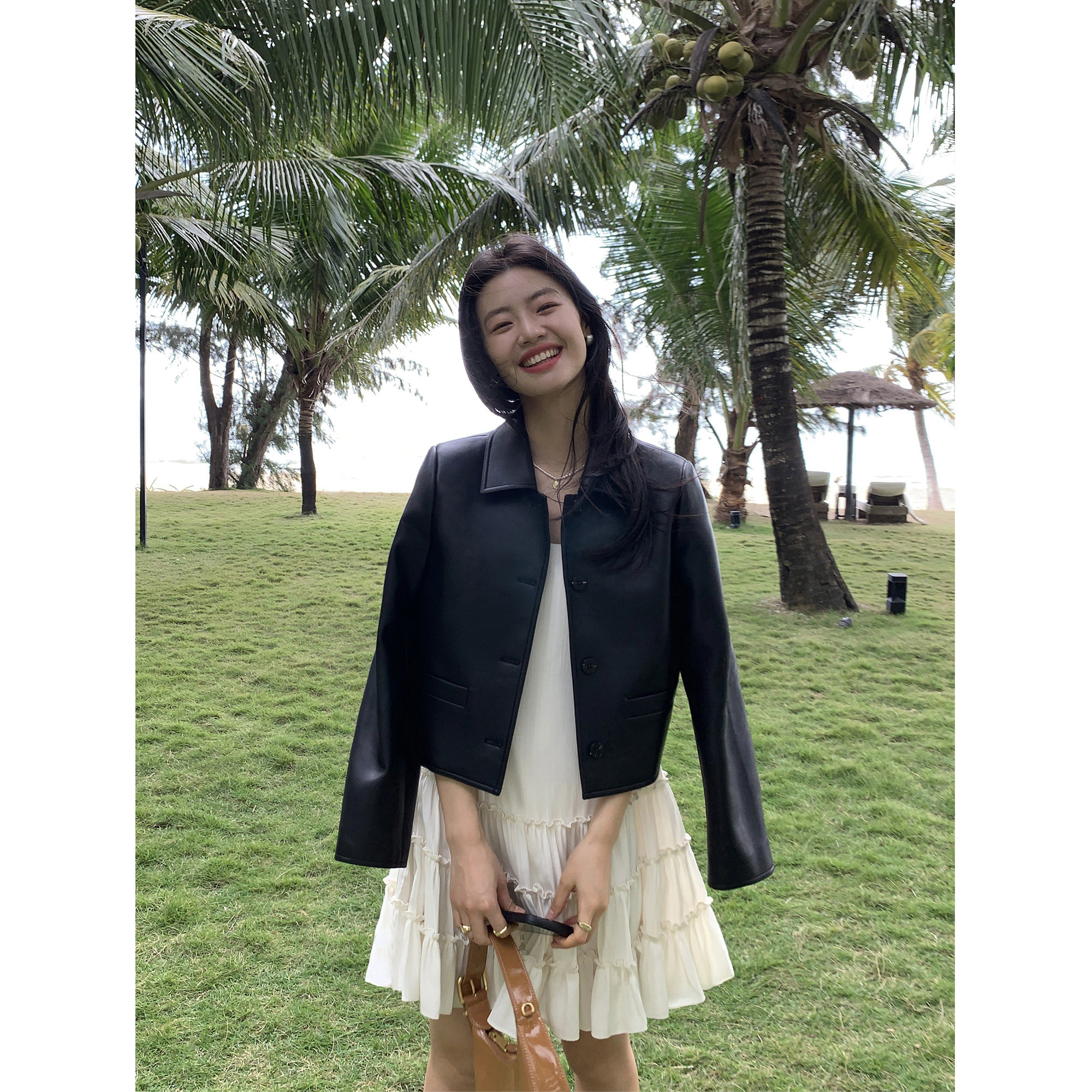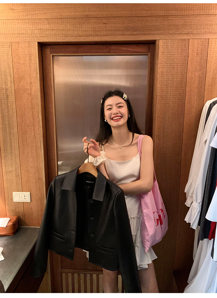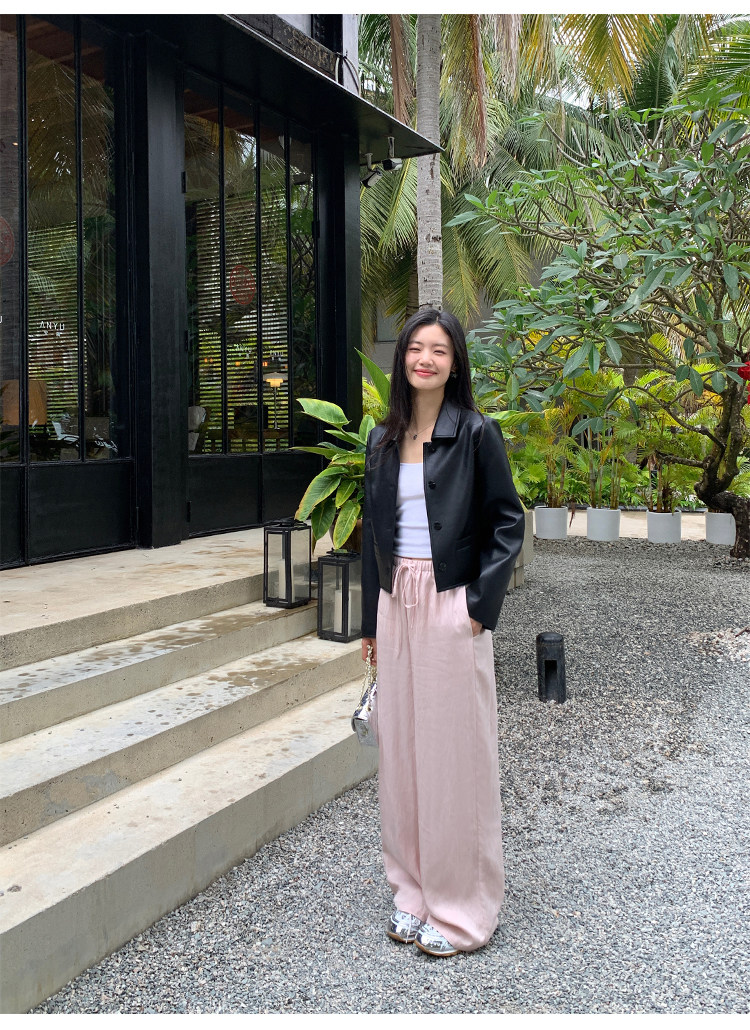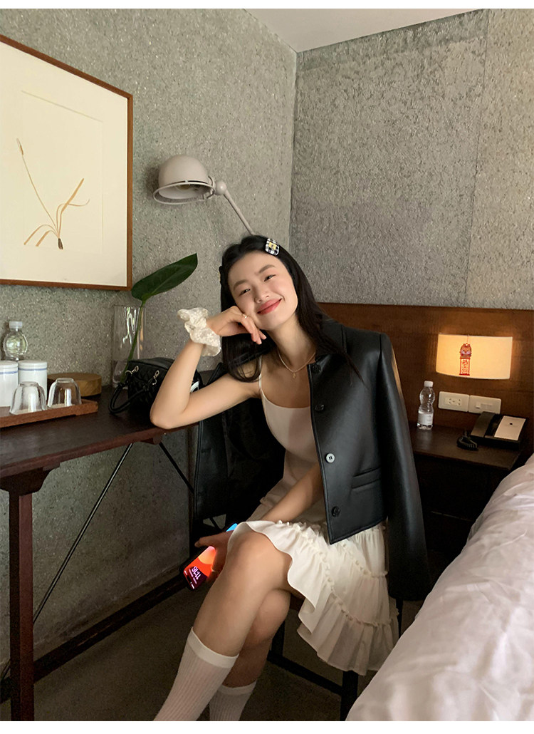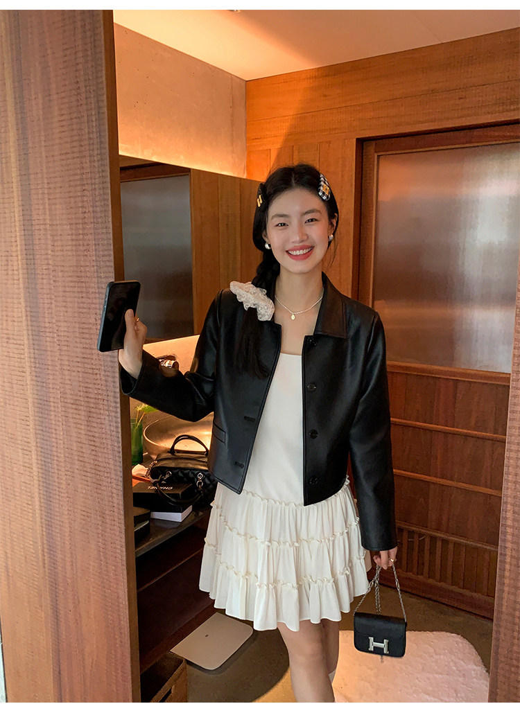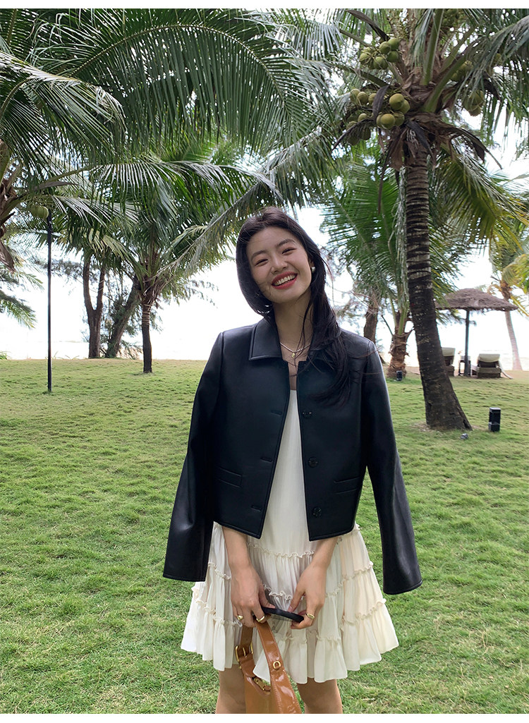 pusumede Черная полиуретановая осенняя короткая куртка, городской стиль