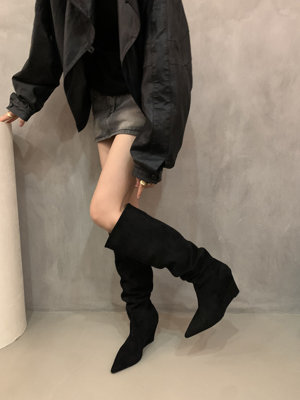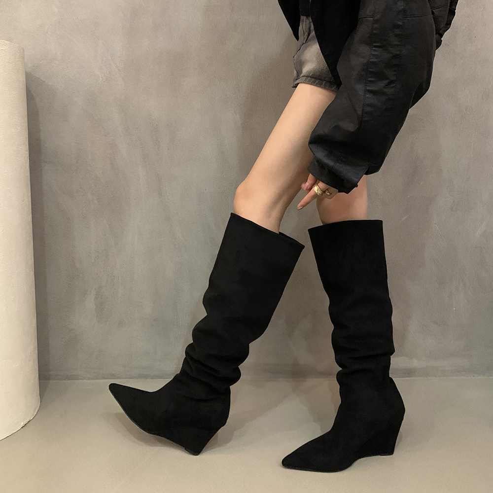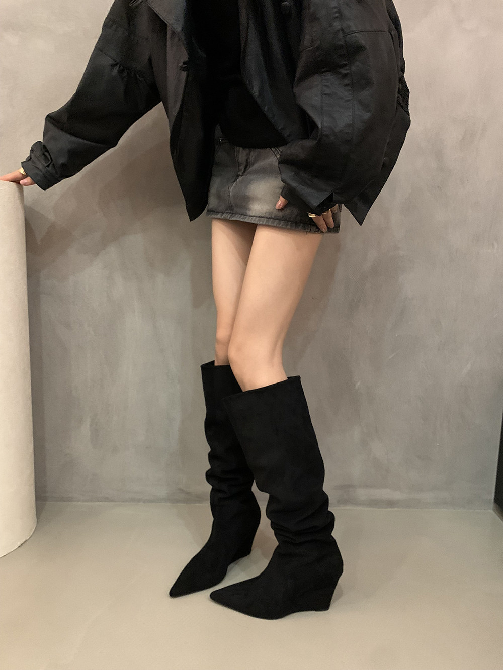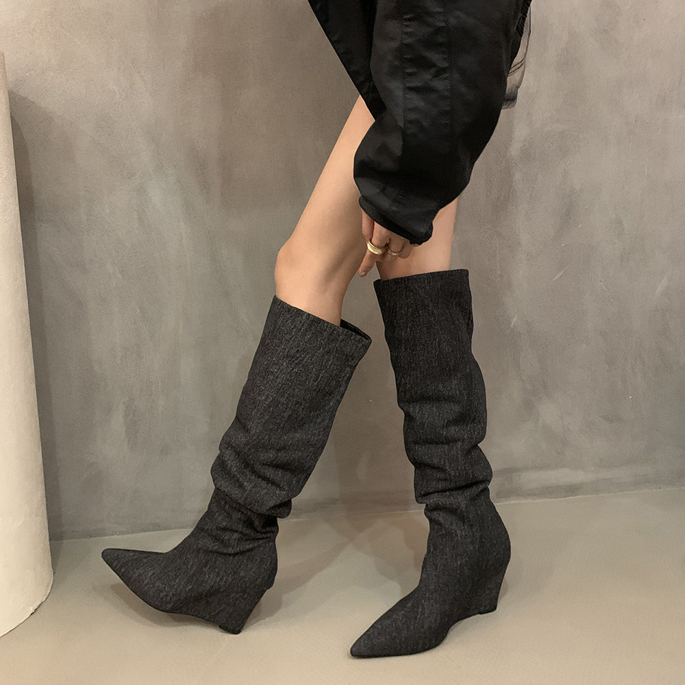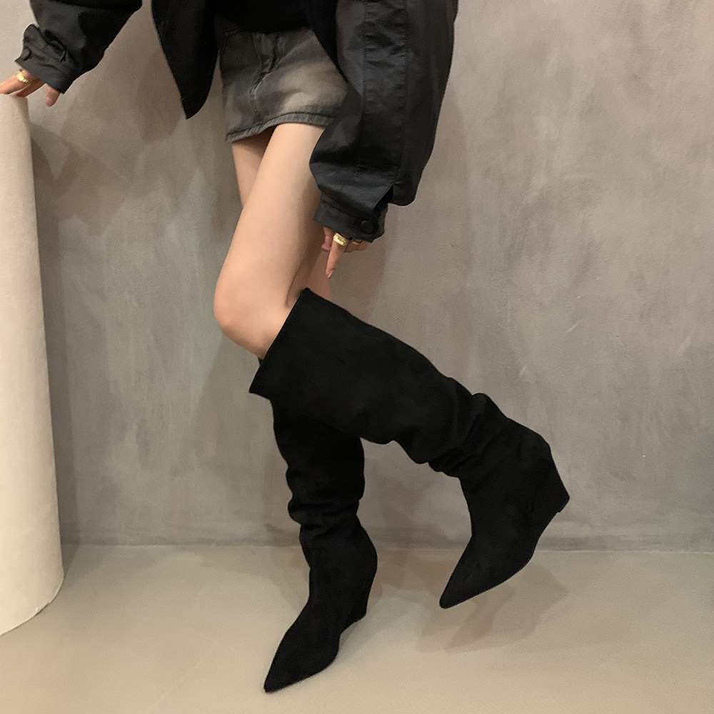 Хаки замшевые высокие сапоги, джинсовые ботинки, французский стиль
