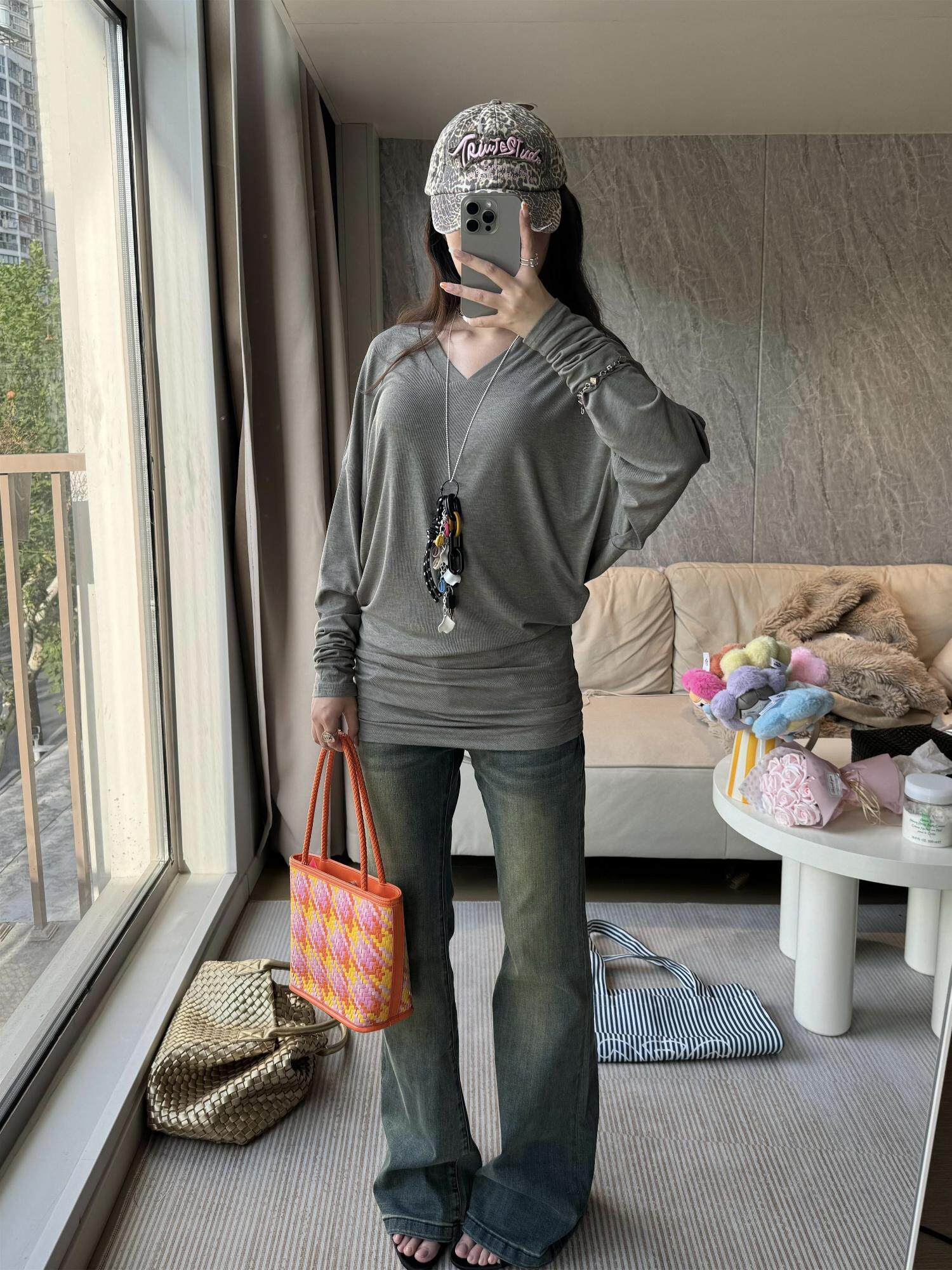 Оригинальная женская футболка из лиоцелла в американском стиле ретро с V-образным вырезом и длинными рукавами, с высоким комфортом, приятным для кожи и сложенным верхом.