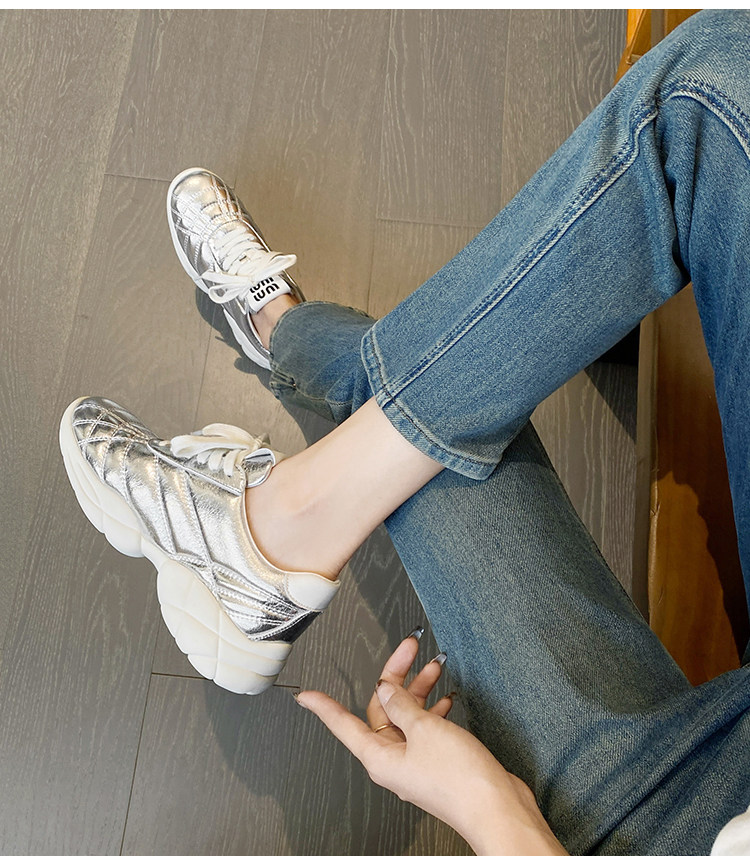 Miumiu, высокая спортивная повседневная обувь на платформе для отдыха с ромбовидным узором, серебряная спортивная обувь, из натуральной кожи