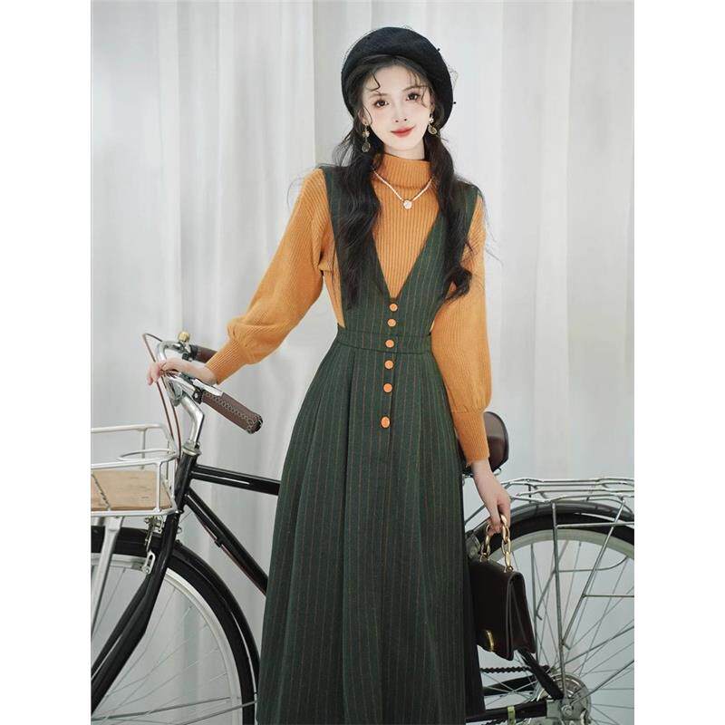 Демисезонный трикотажный свитер, подтяжки, платье, базовый комплект, французский стиль, яркий броский стиль