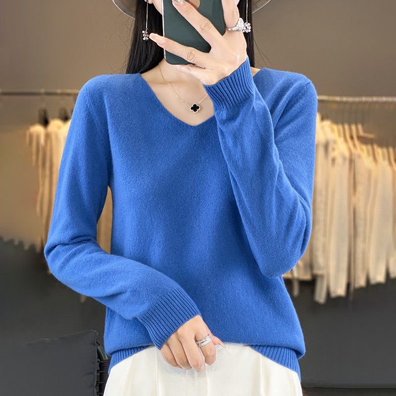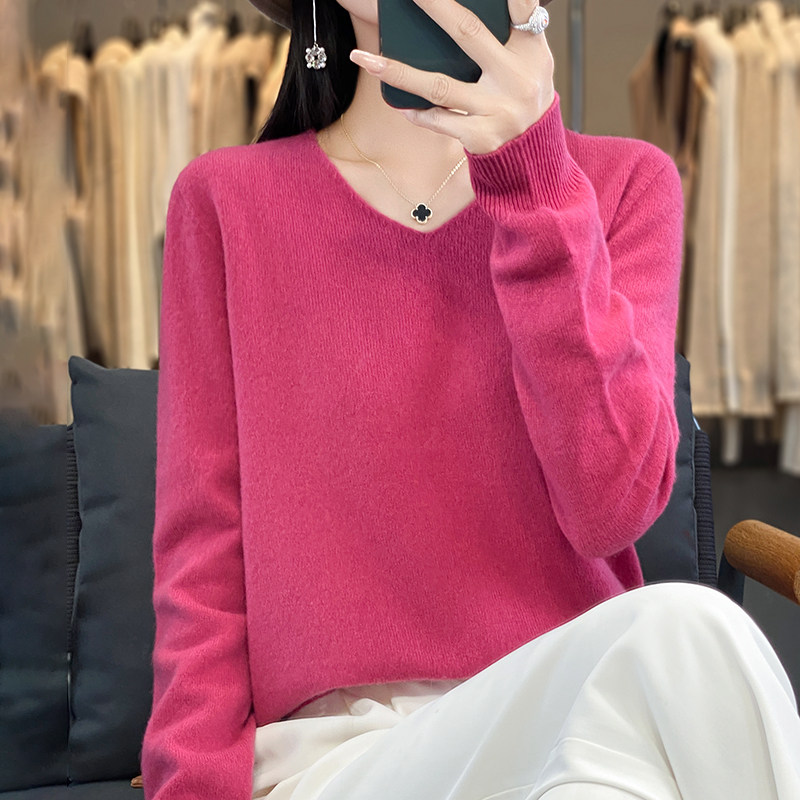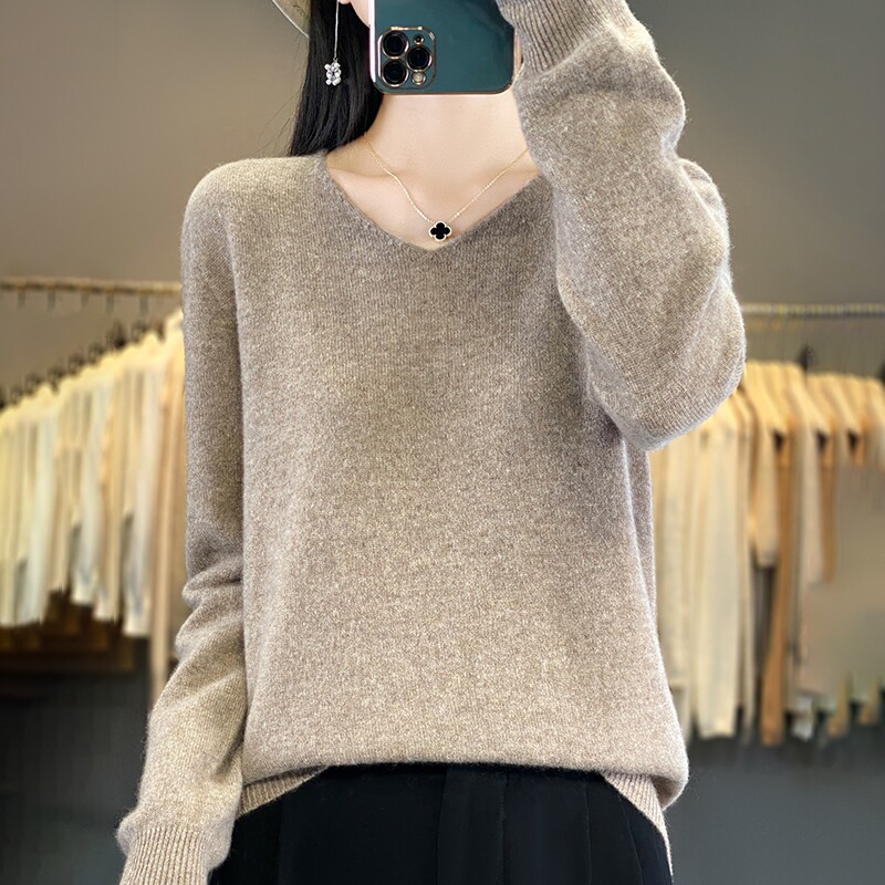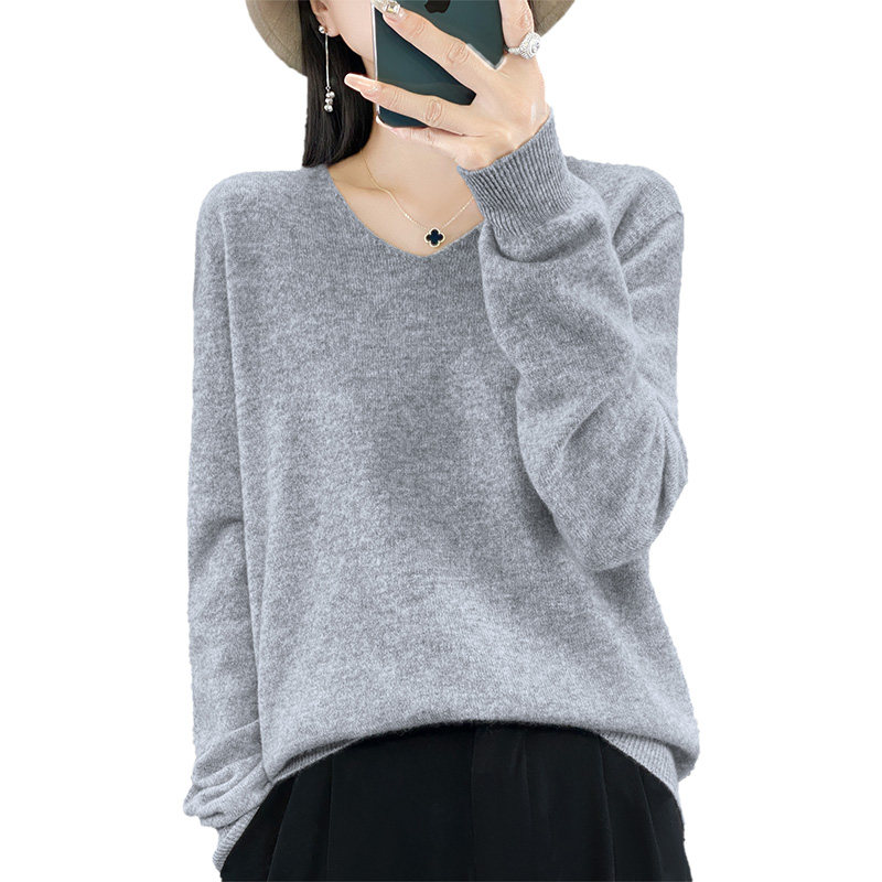 Шерстяной базовый приятный телу демисезонный трикотажный свитер, V-образный вырез, свободный крой