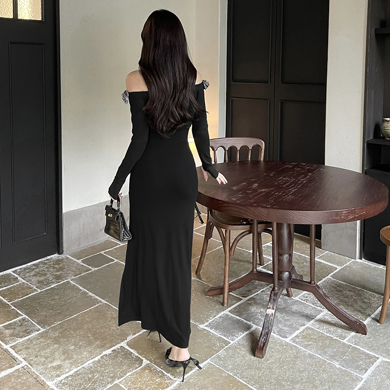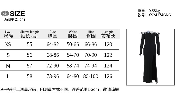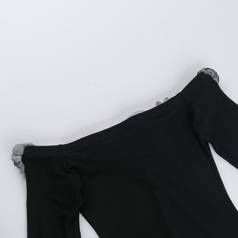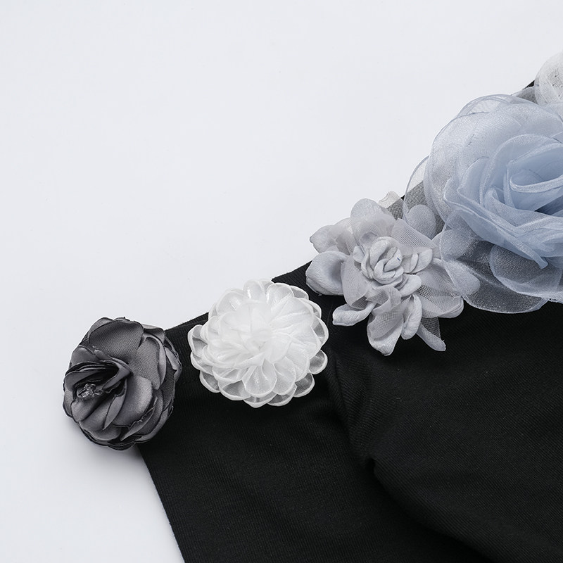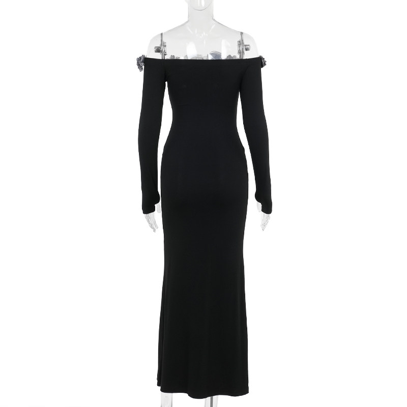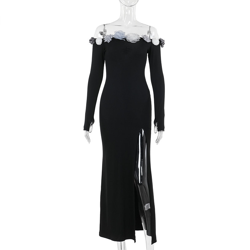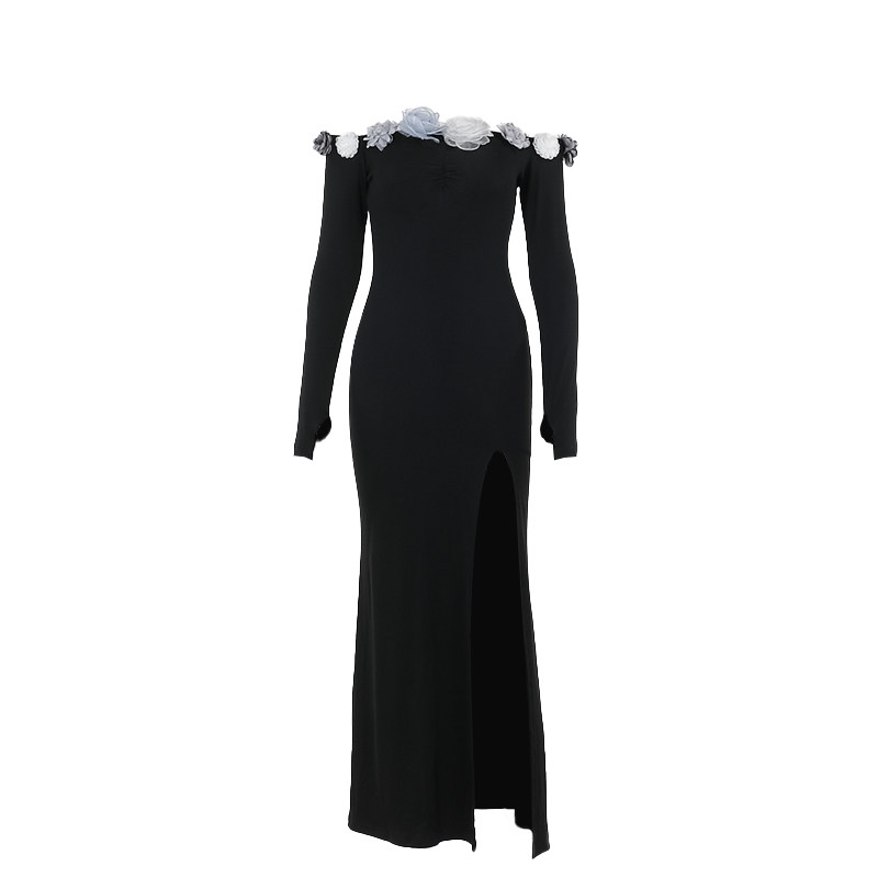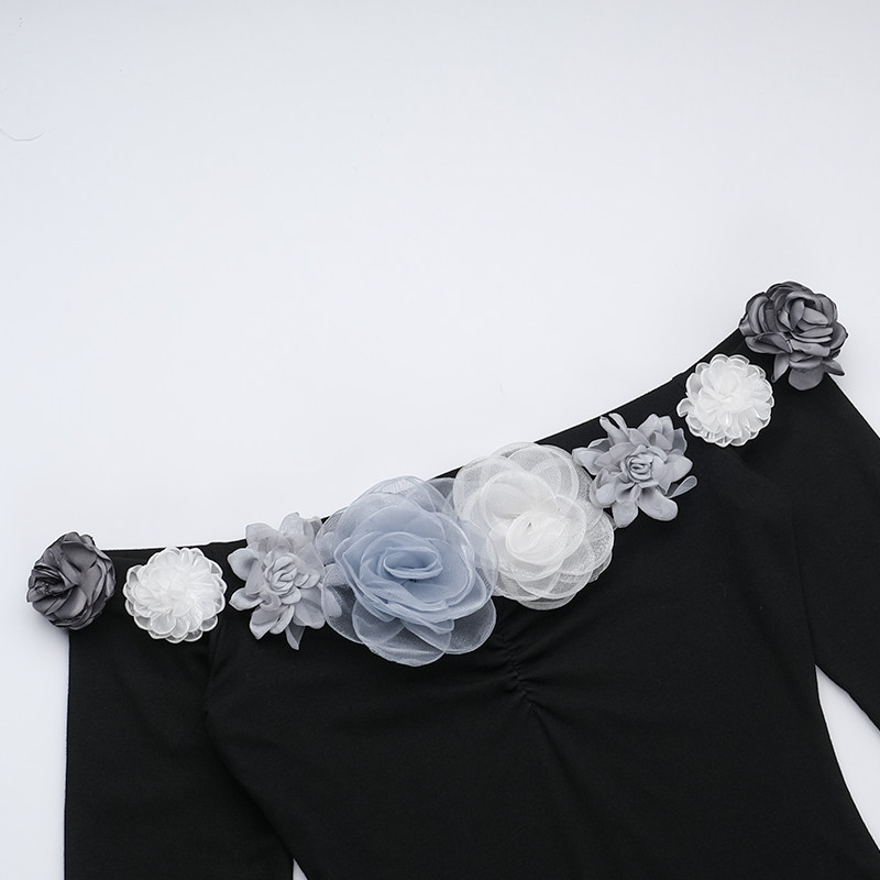 Черная сексуальная трехмерная осенняя длинная юбка, открытые плечи, в цветочек