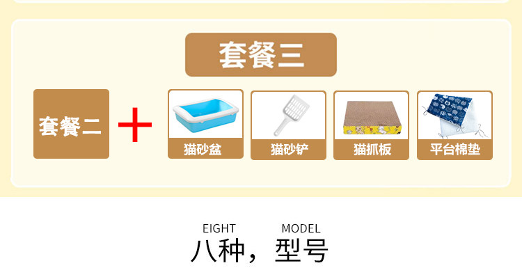 | Применимый размер: | Пакет первый [решетчатые ножки + поднос + ремни + инструкции по установке], Пакет 2 [Пакет 1+кошачьи гнезда+кошачья чаша+дразнящая кошачья палочка+гамак], Пакет 3 [Set Meal 2+поддерживающая кошачья песчаная кастрюль+кошачья песчаная лопата+кошачья царапина] |