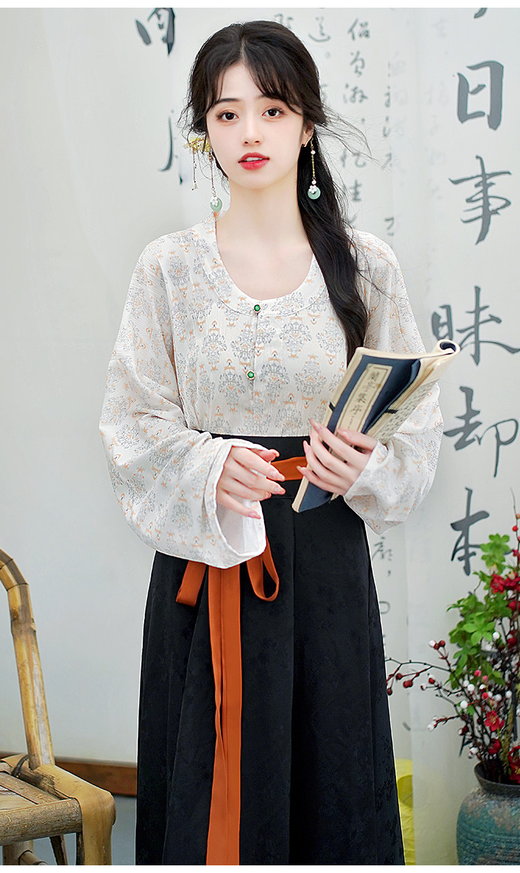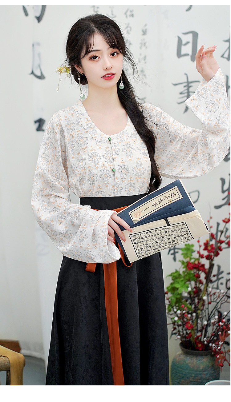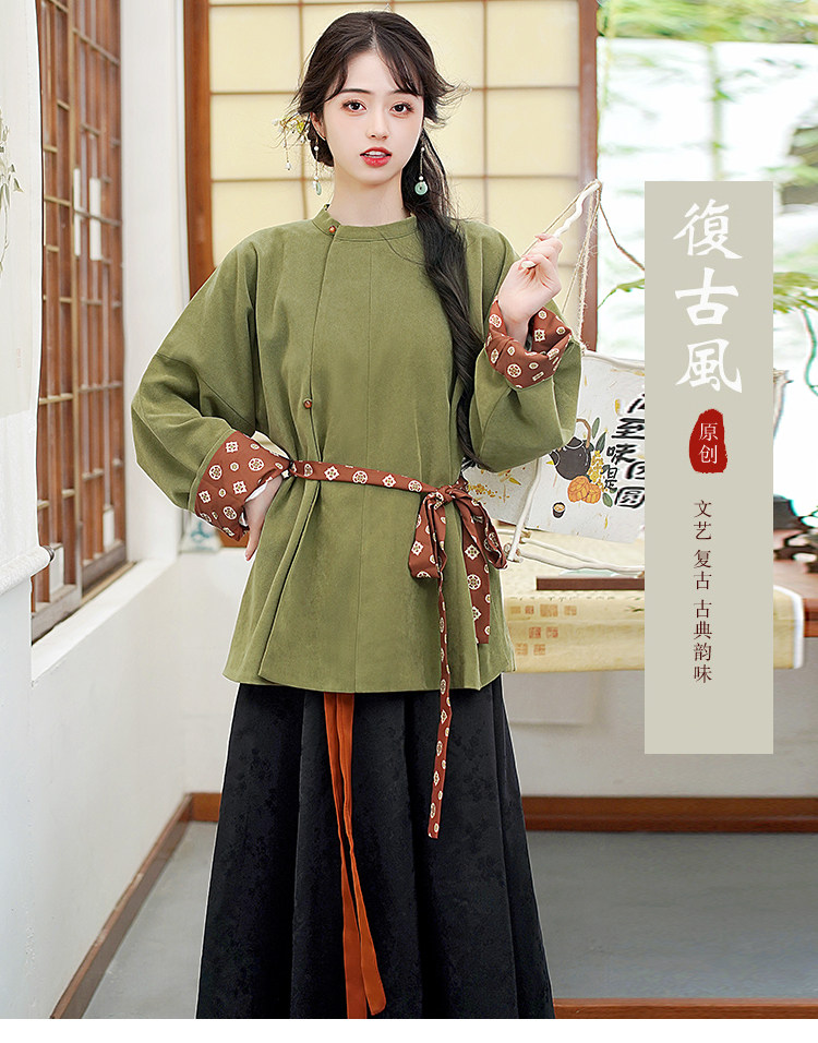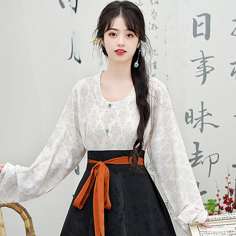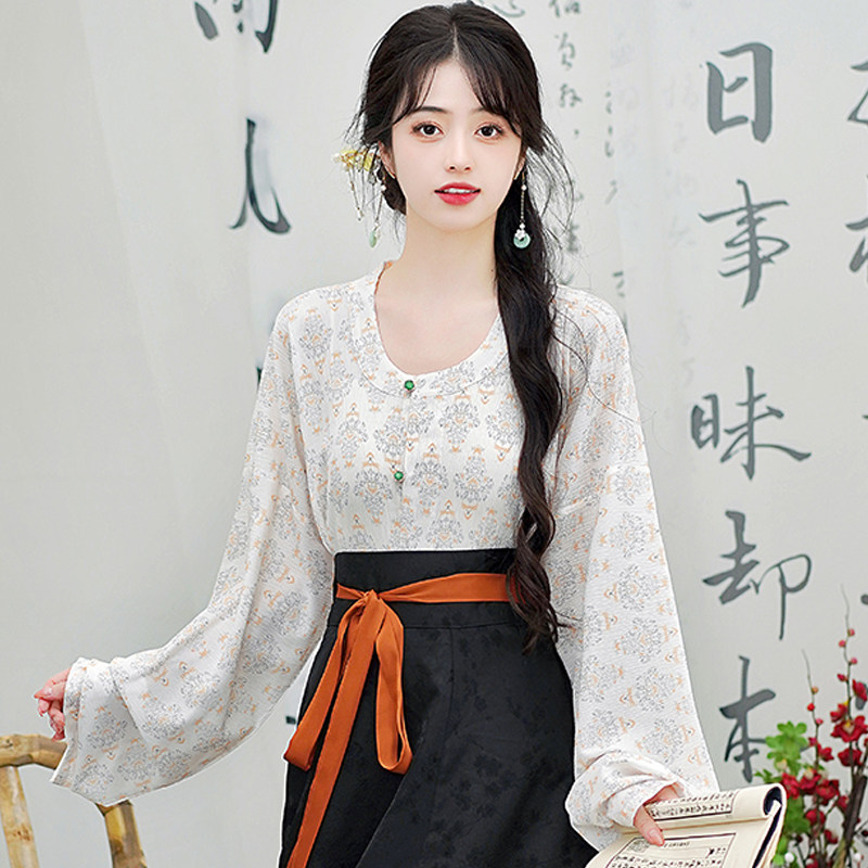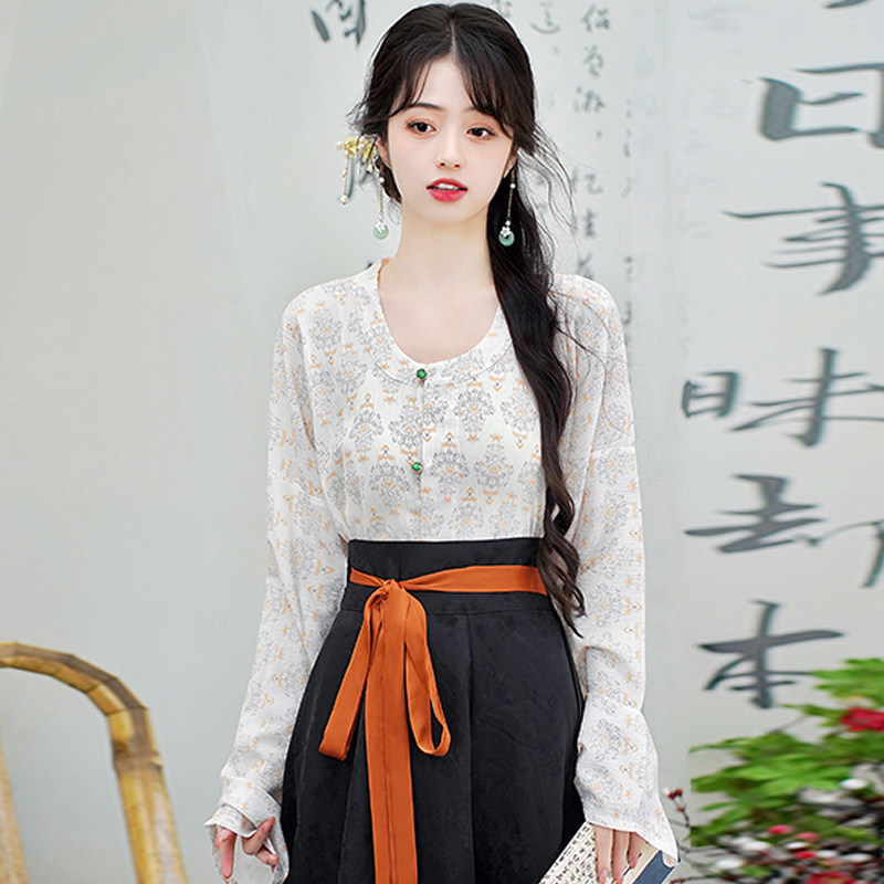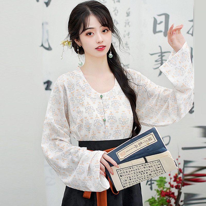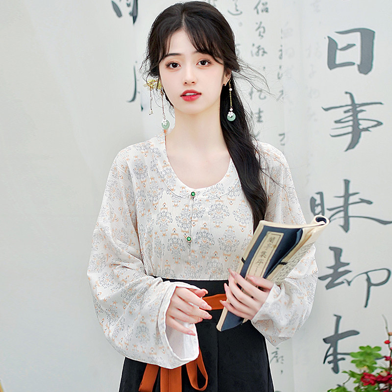Династия Танга висящая рубашка с рубашкой круглая шея Улучшена ханфу топ династия Длинные рукава с двумя грудными короткими рубашкой для женщин осень