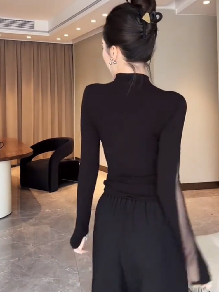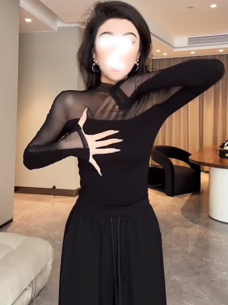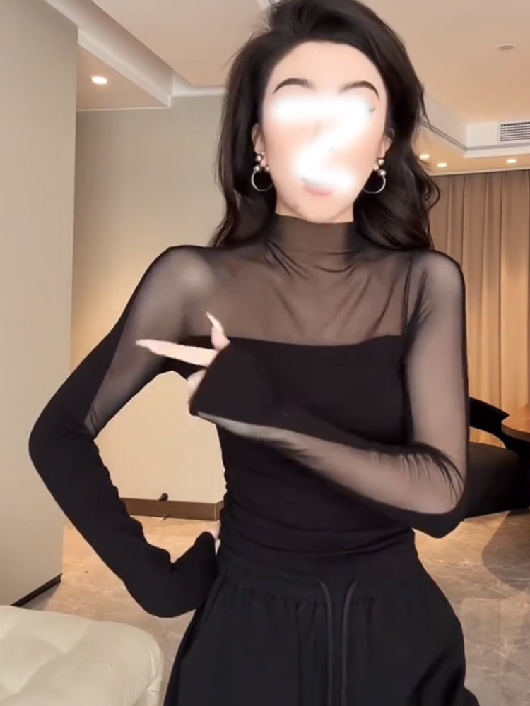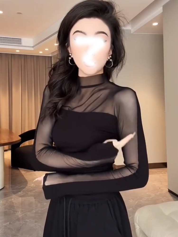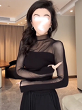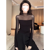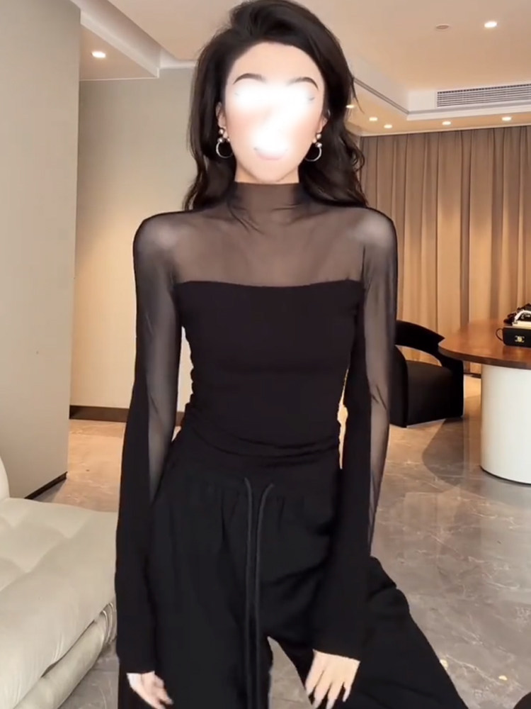 Черная сетчатая рубашка с воротником до половины высоты для женщин осенью и зимой, сексуальный прозрачный топ для похудения