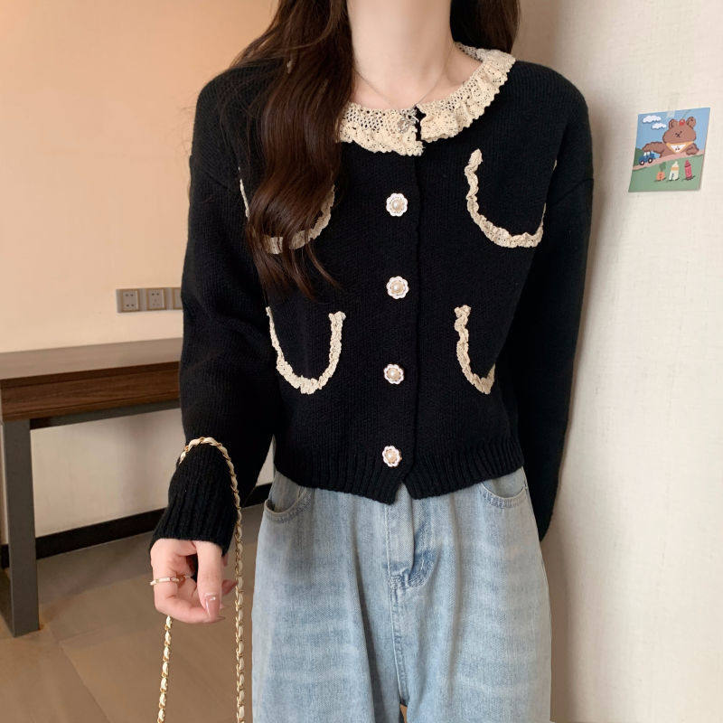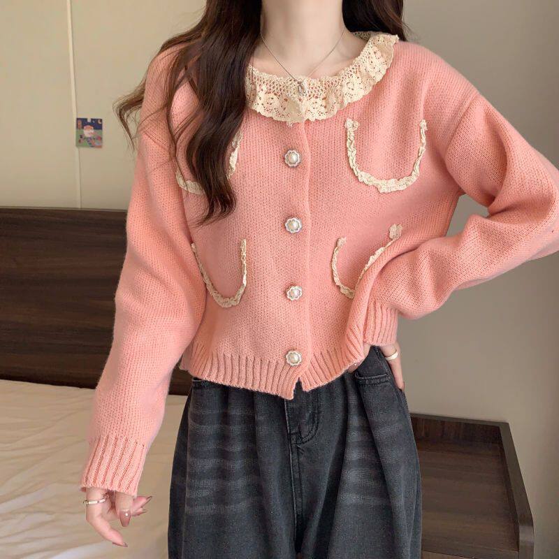 Милый демисезонный кардиган, кружевная утепленный лонгслив, свитер с круглым воротником, куртка, в стиле Шанель, кружевное платье