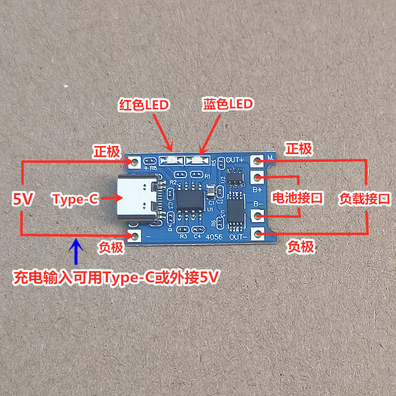 Сиденье USB Type-C USB и +- PAD рядом с ним представляют собой терминал ввода мощности, который подключен к напряжению 5V.B+ подключается к положительному уровню литийной батареи и B- подключается к отрицательному отрицательному аккумулятору лития.Out+ и Out- подключены к нагрузкам, таким как подключение к положительным и отрицательным мобильным бустерным пластинкам или другими нагрузками.