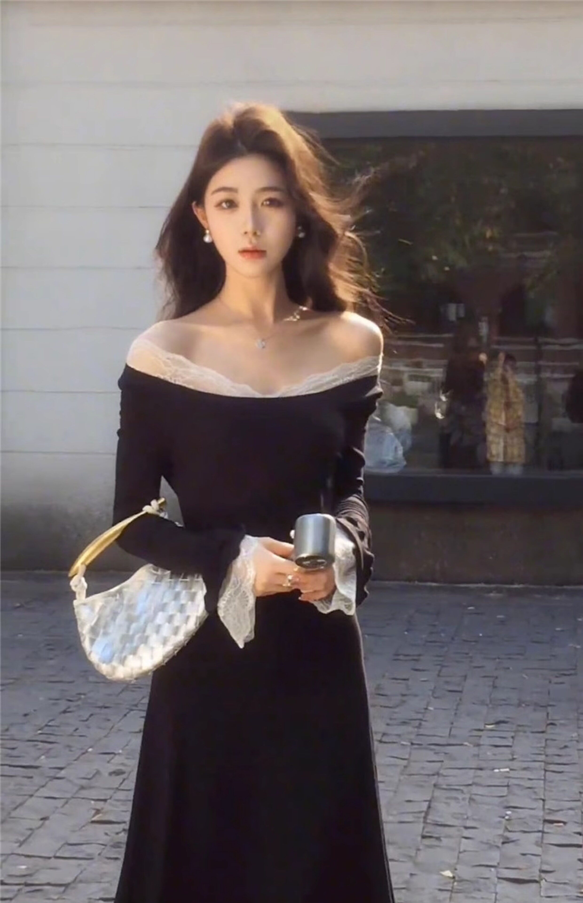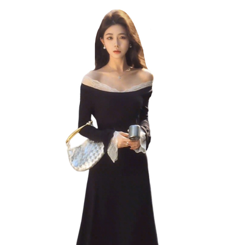 Черное весеннее платье, длинная юбка, французский стиль, открытые плечи, премиум класс