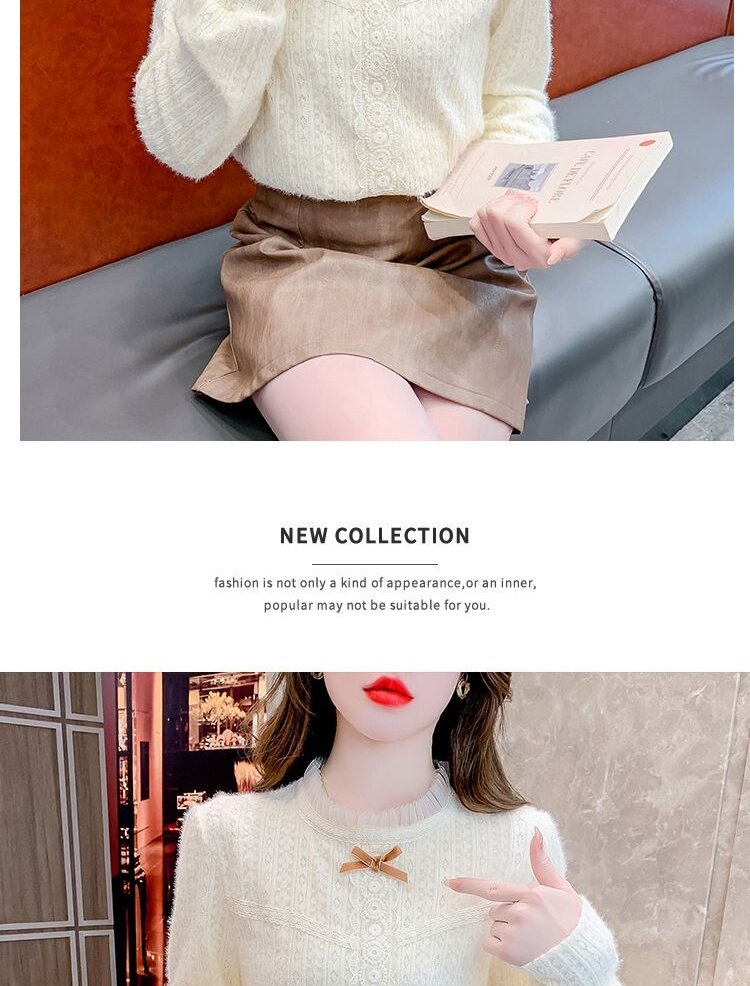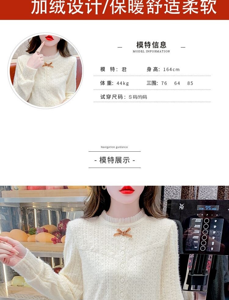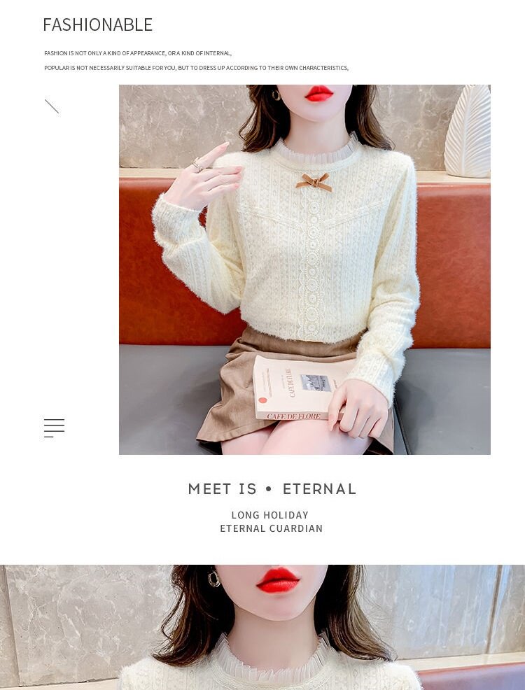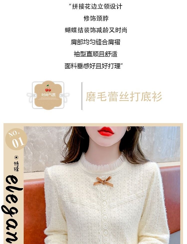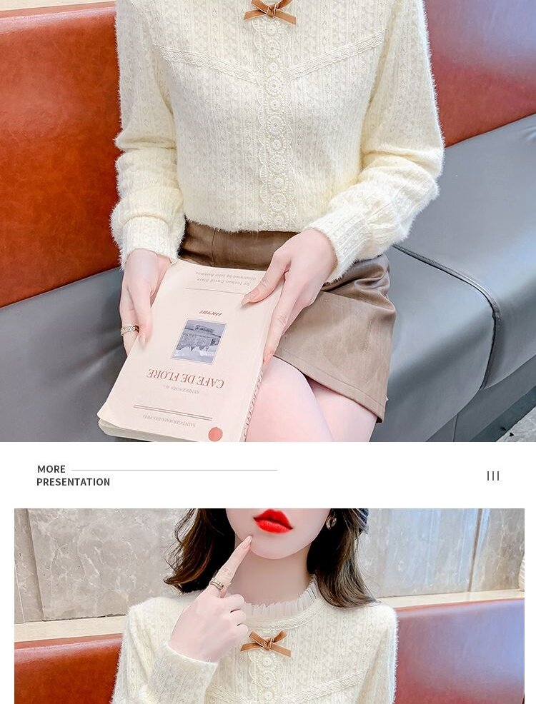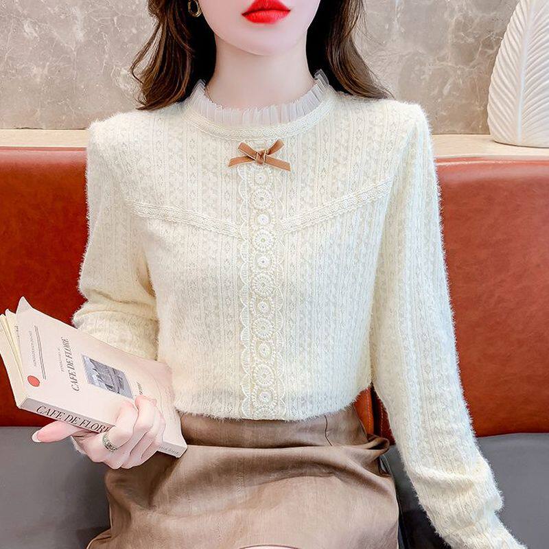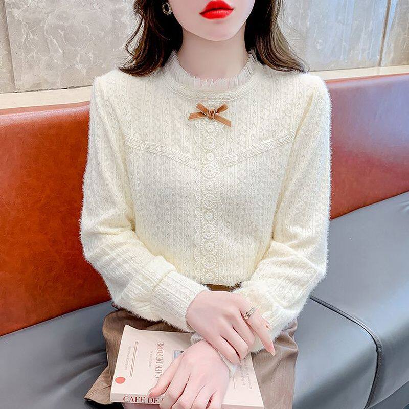 Утепленный демисезонный кружевной лонгслив с бантиком, в корейском стиле