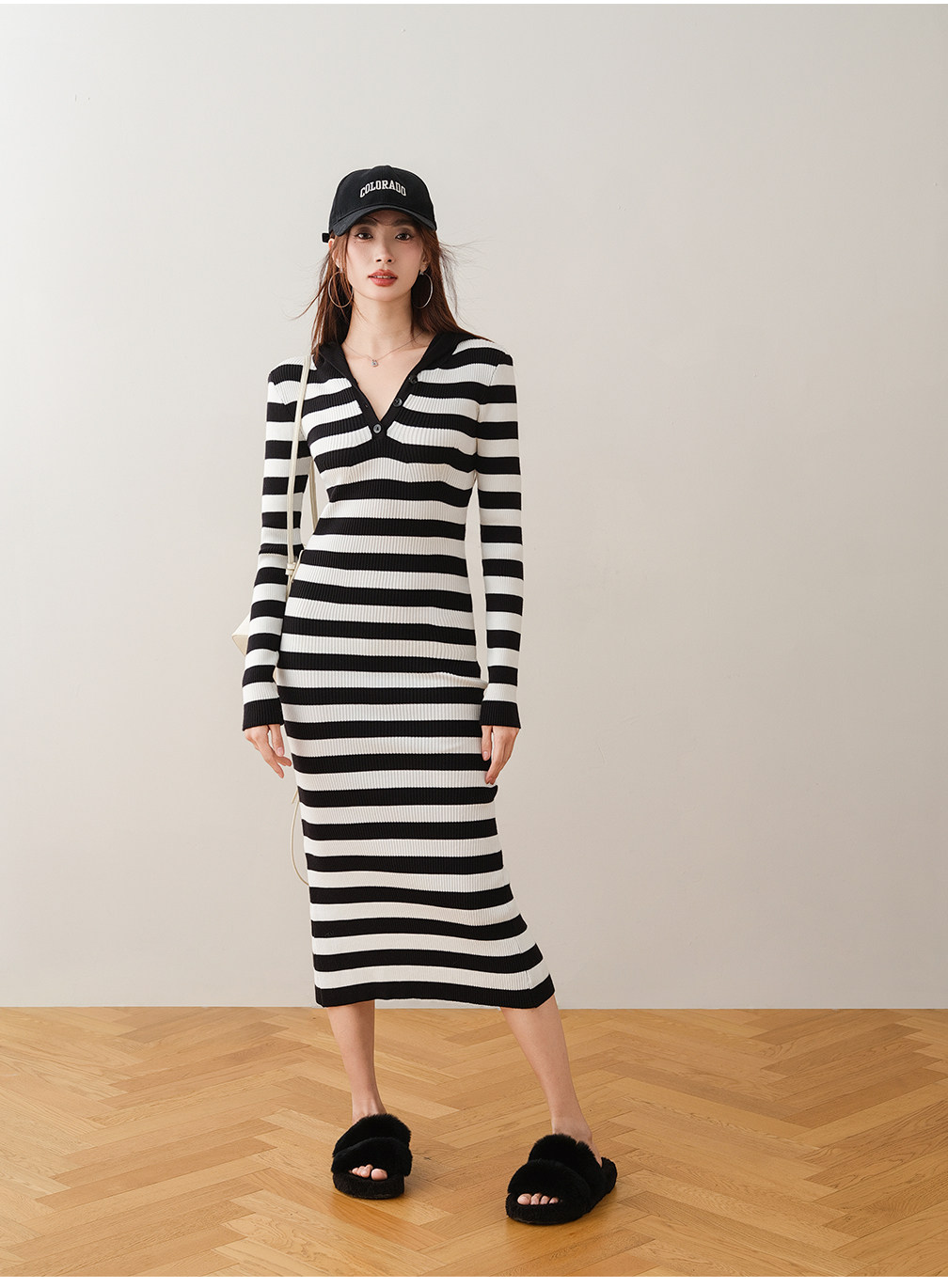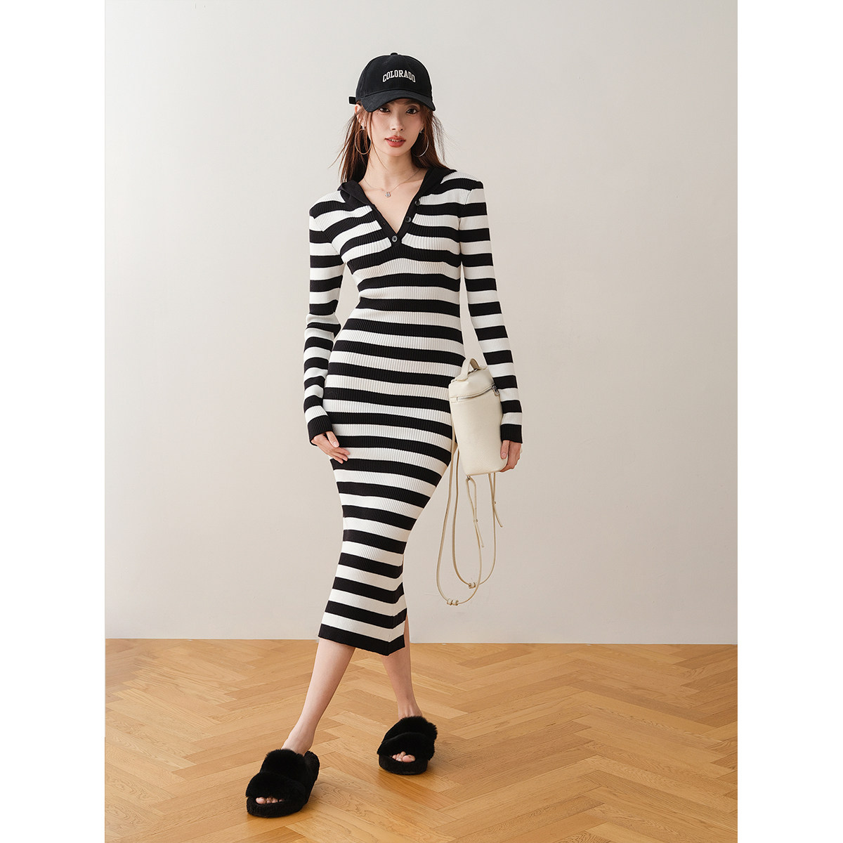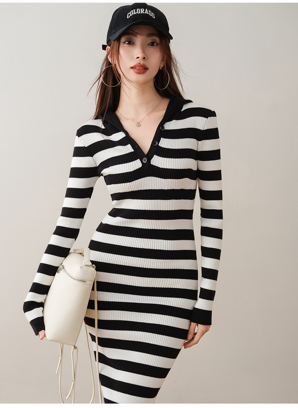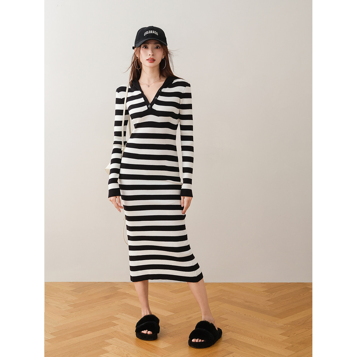 ron&ron Полосатая тонкая вязаная юбка с дикой капюшоном 2024 Осень и зимняя сумка с темпераментом.