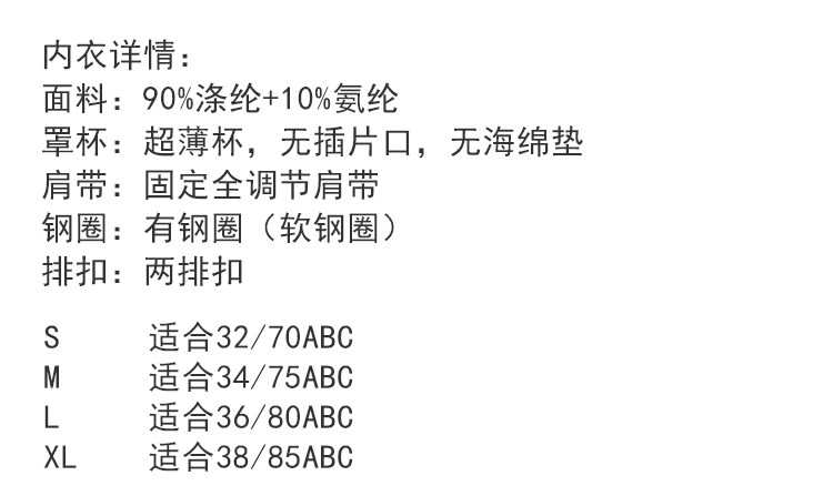 | Размер: | S [70a 70b 70c], M 【75a 75b 75c】, L 【80a 80b 80c】, Xl 【85a 85b 85c】】 |