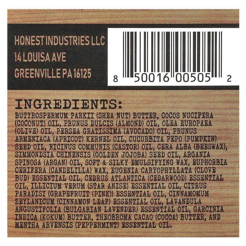 Масло ши, кокосовое масло, миндальное масло, оливковое масло, масло авокадо, миндальное масло, тыквенное масло, касторовое масло, пчелиный воск, масло семян золотого жожоба, аргановое масло, мягкий и шелковистый эмульгирующий воск, канделильский воск, эфирное масло гвоздики, эфирное масло кедра, эфирное масло звездчатого аниса, эфирное масло листьев корицы, эфирное масло лаванды, масло индийской лозы, масло какао и Эфирное масло мяты перечной.