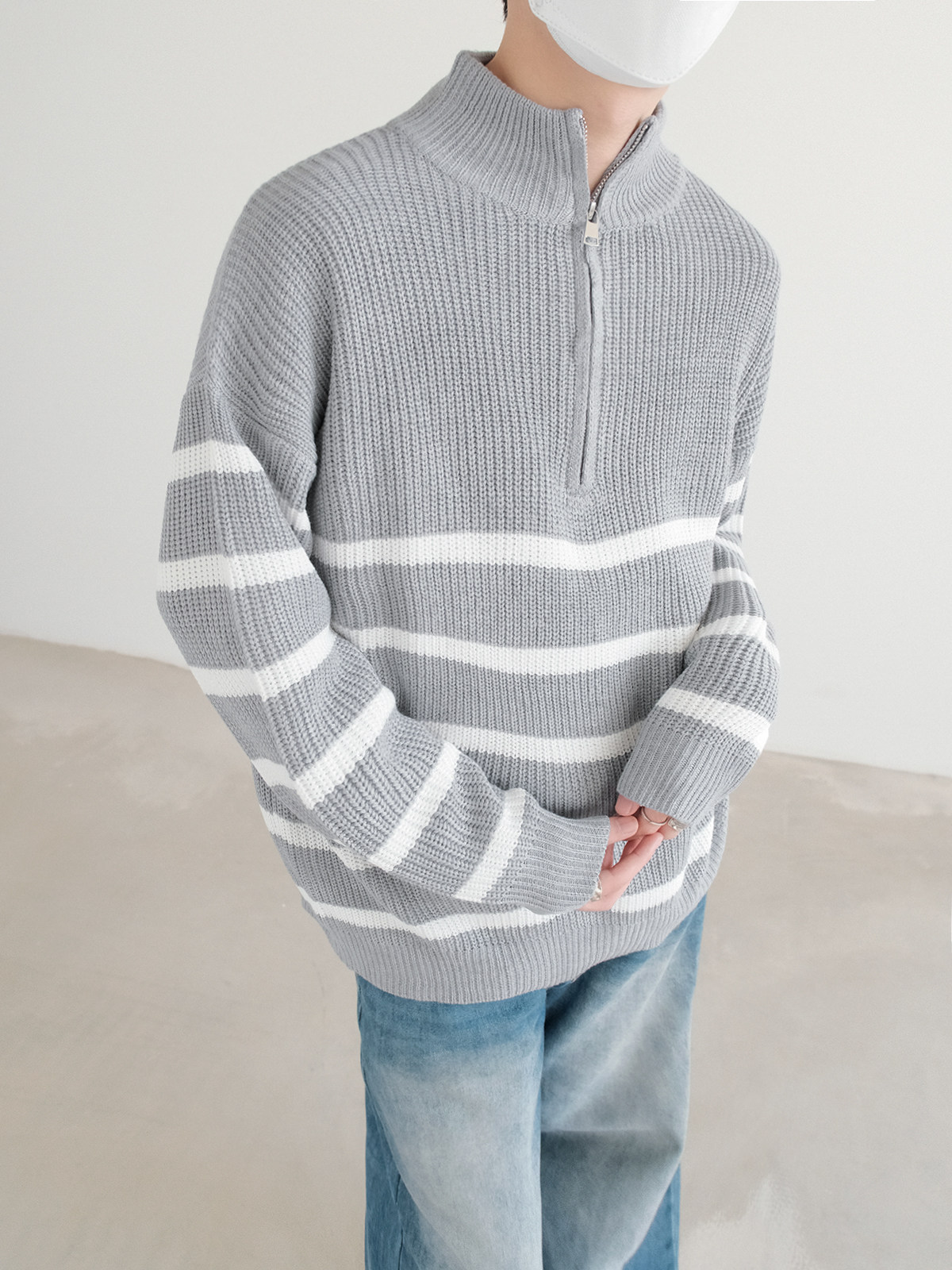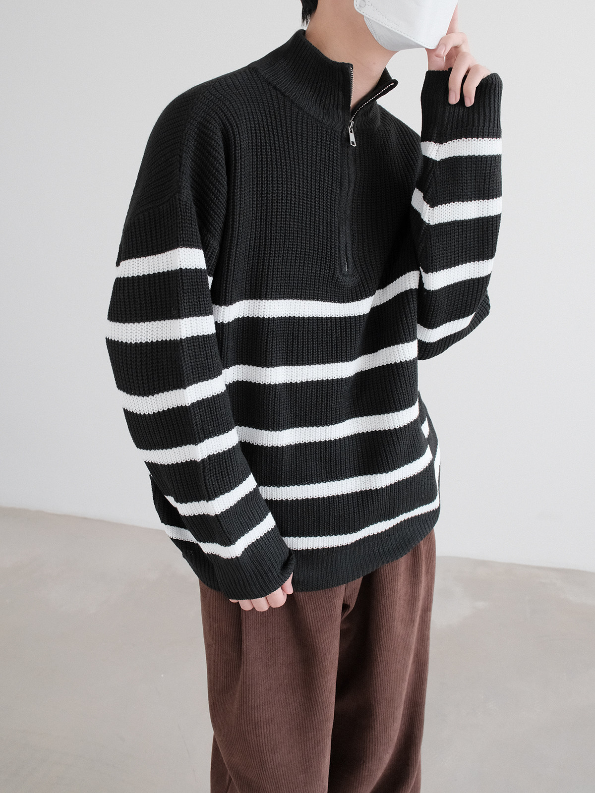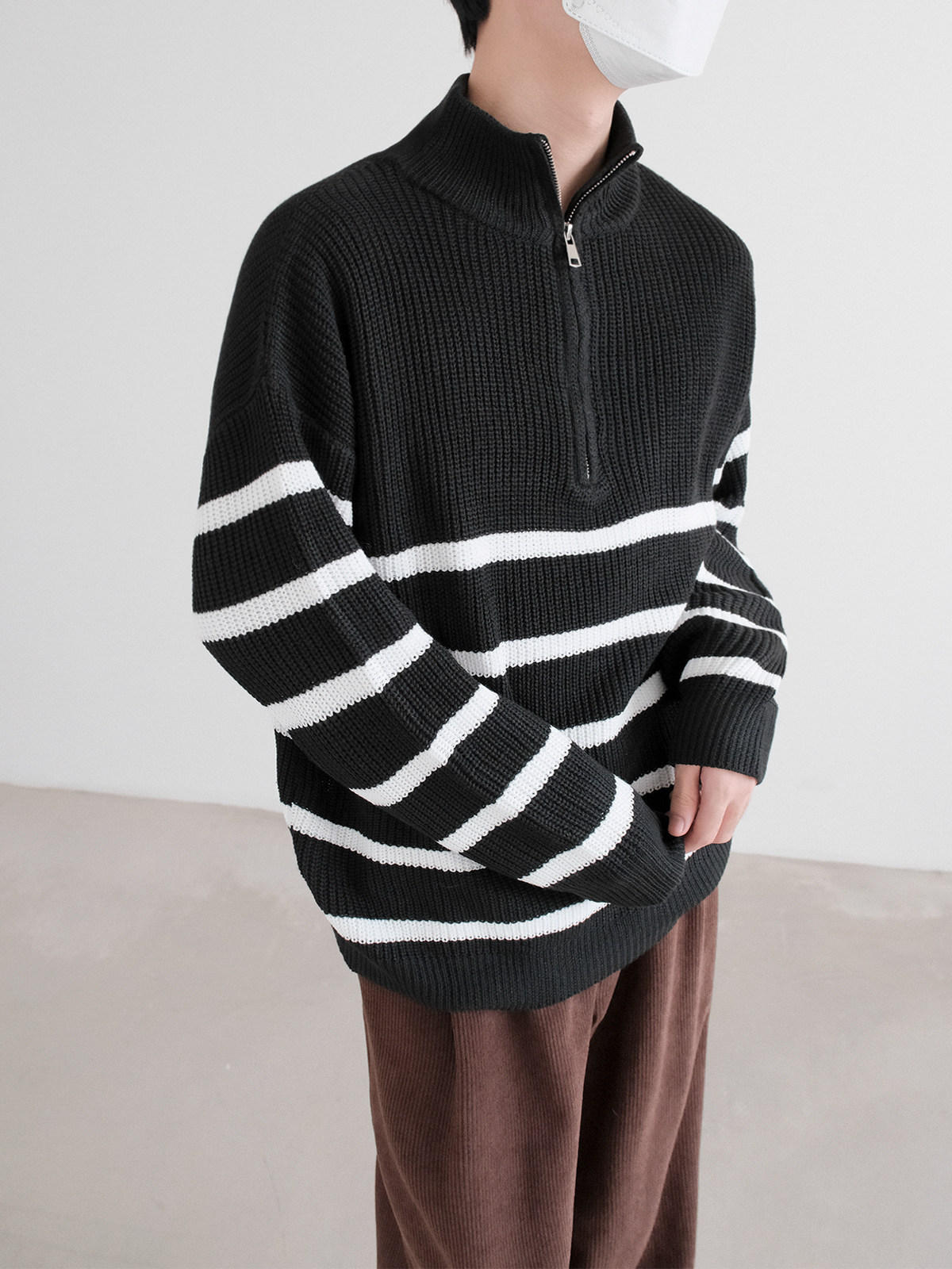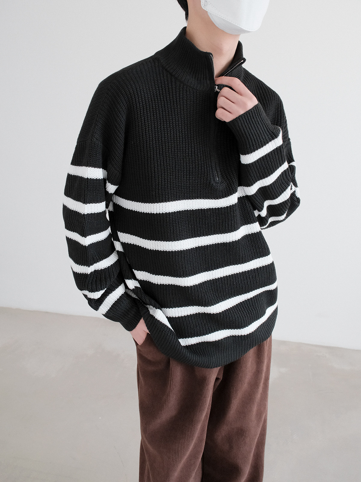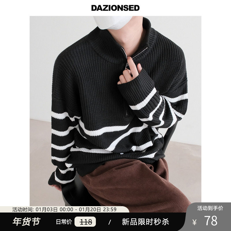 Новинки весны и зимы 2025: полосатый свитер с воротником-стойкой и половиной молнии.