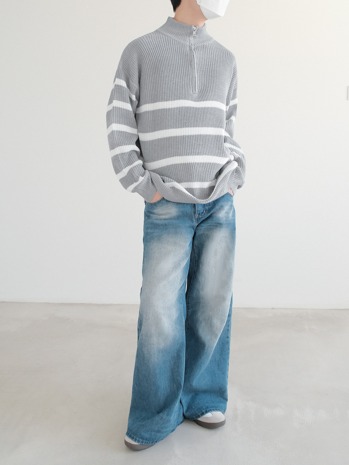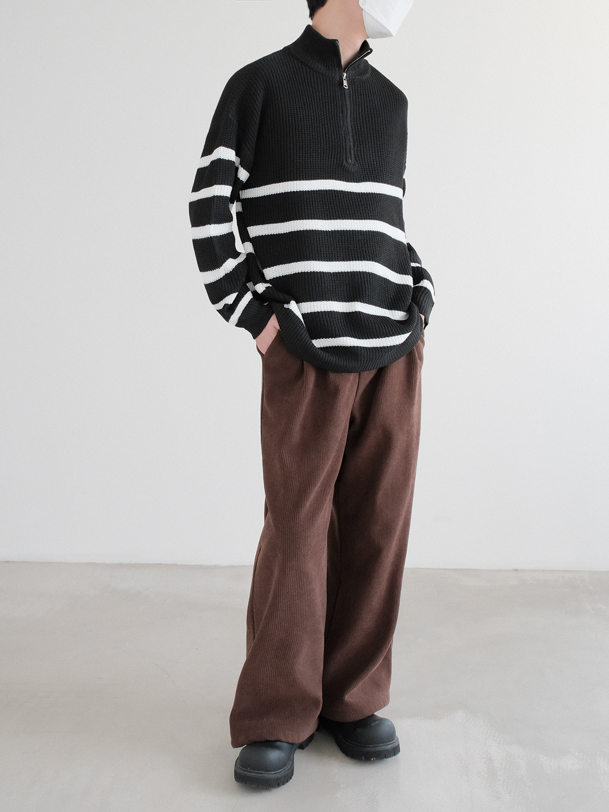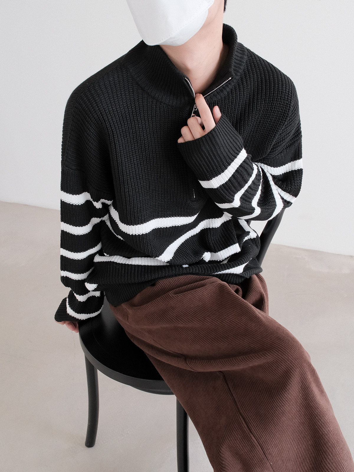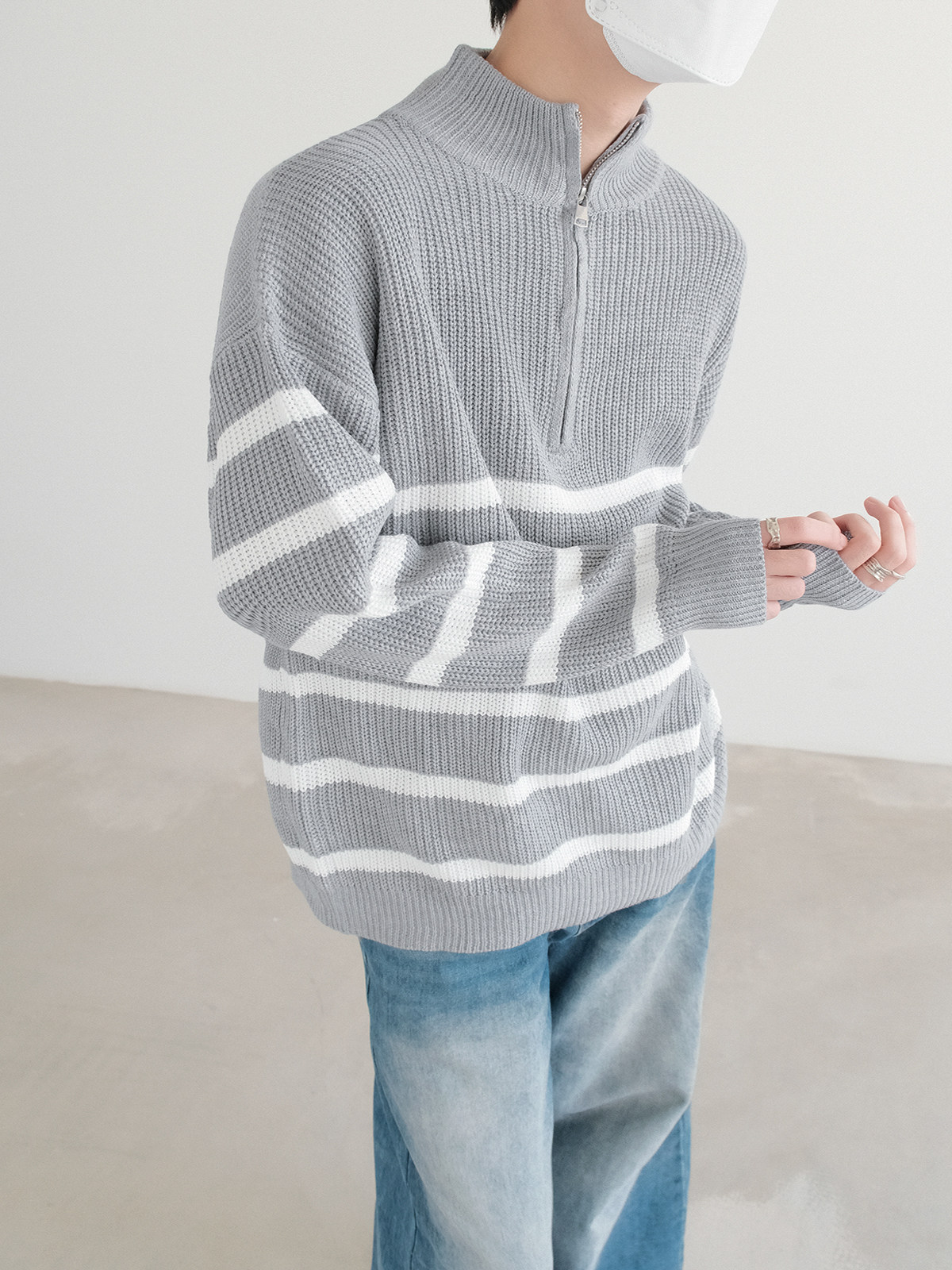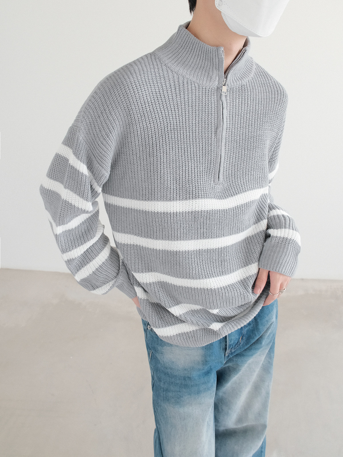 Новинки весны и зимы 2025: полосатый свитер с воротником-стойкой и половиной молнии.