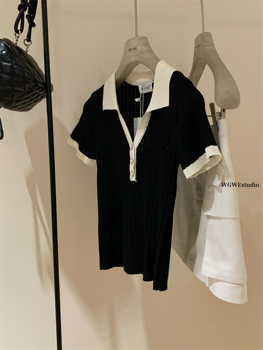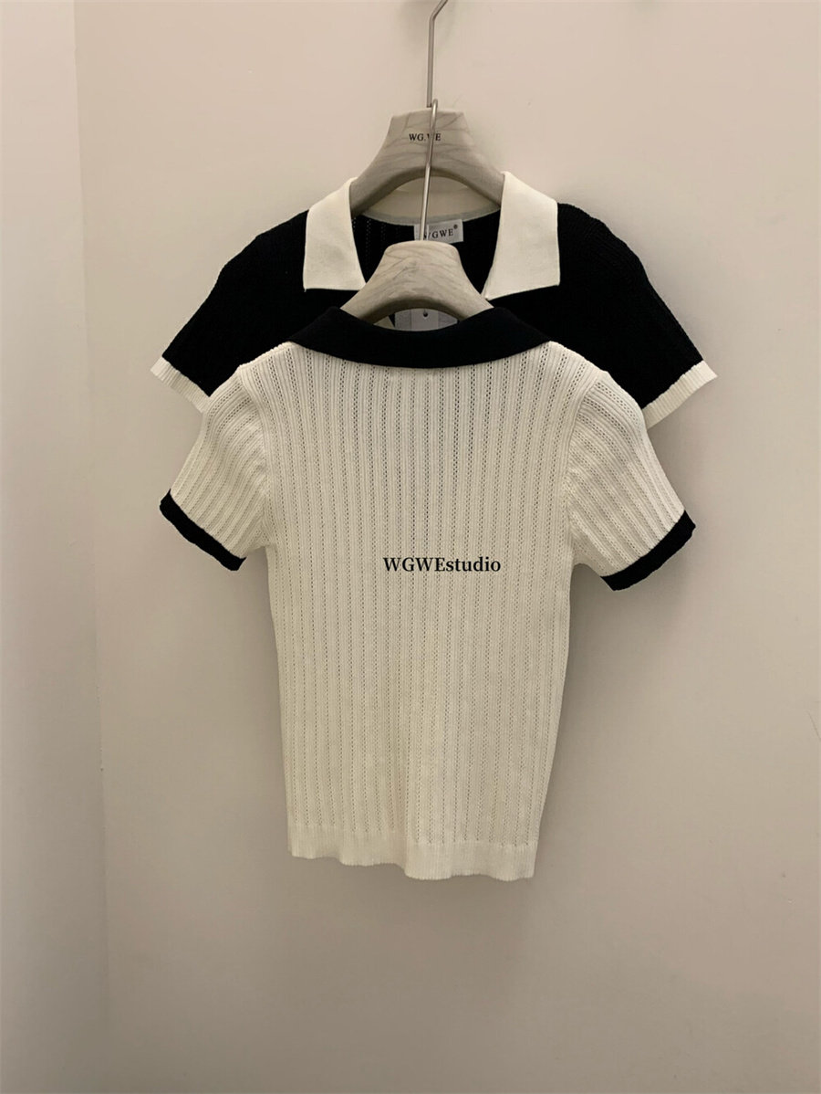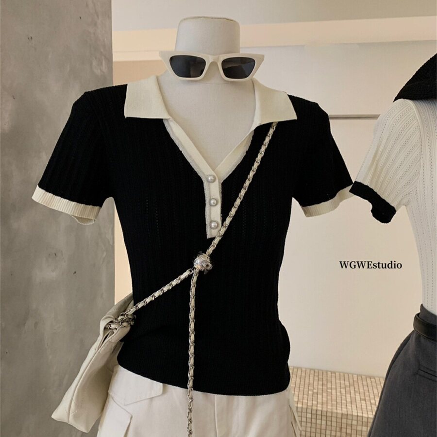 WGWE в студенческом стиле, тонкий свитер с короткими рукавами и контрастными лацканами на правом плече, женские весенне-летние миниатюрные топы 2025 года