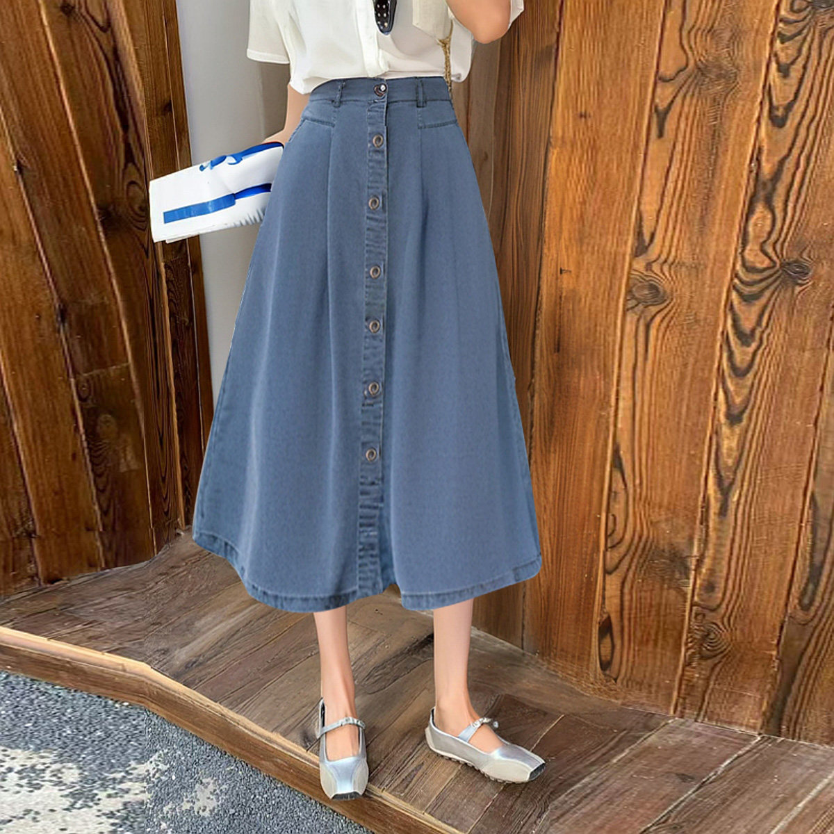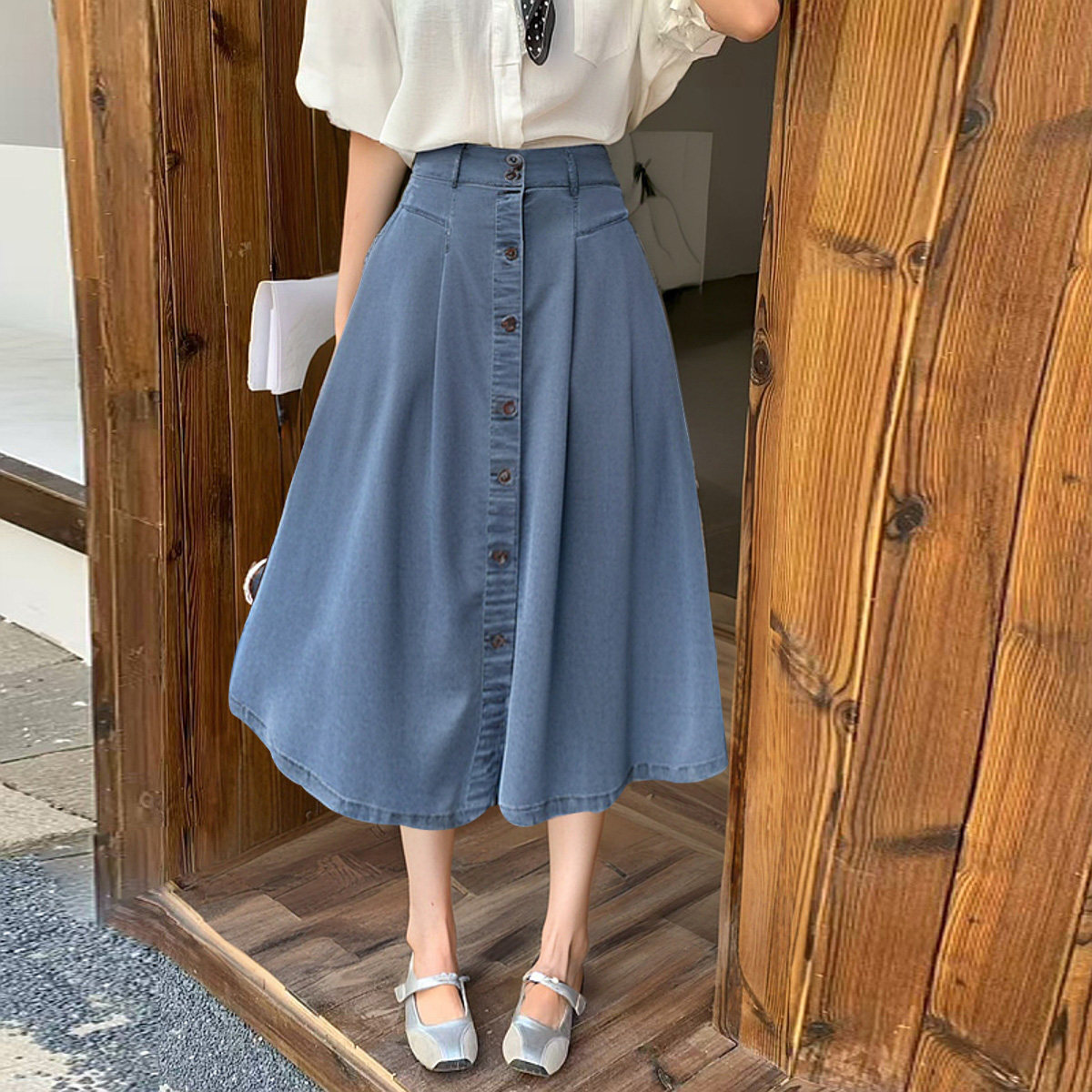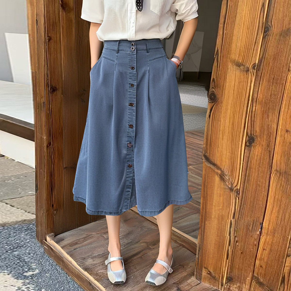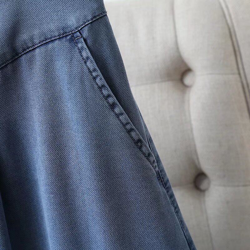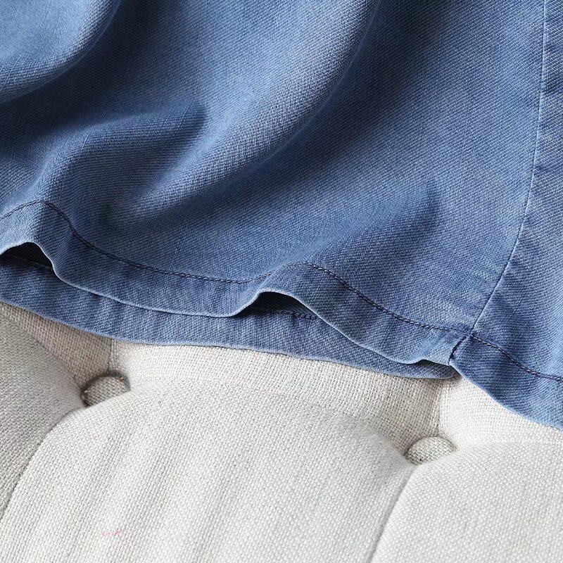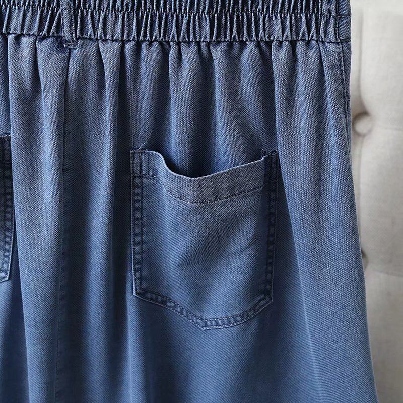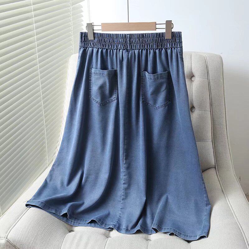 Летняя джинсовая юбка, облегающий крой, высокая талия, А-силуэт, длина миди