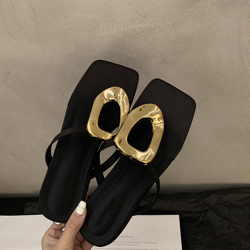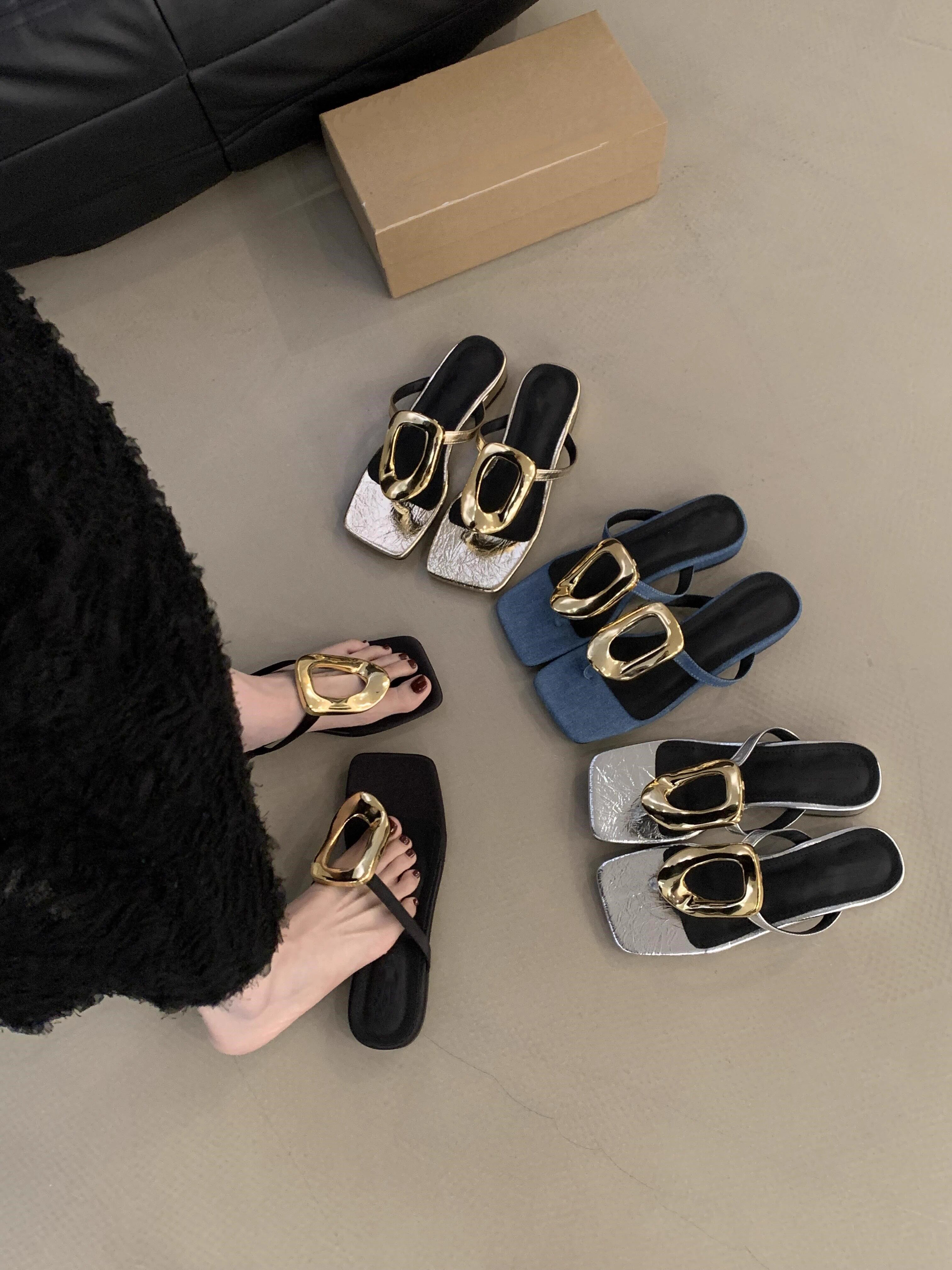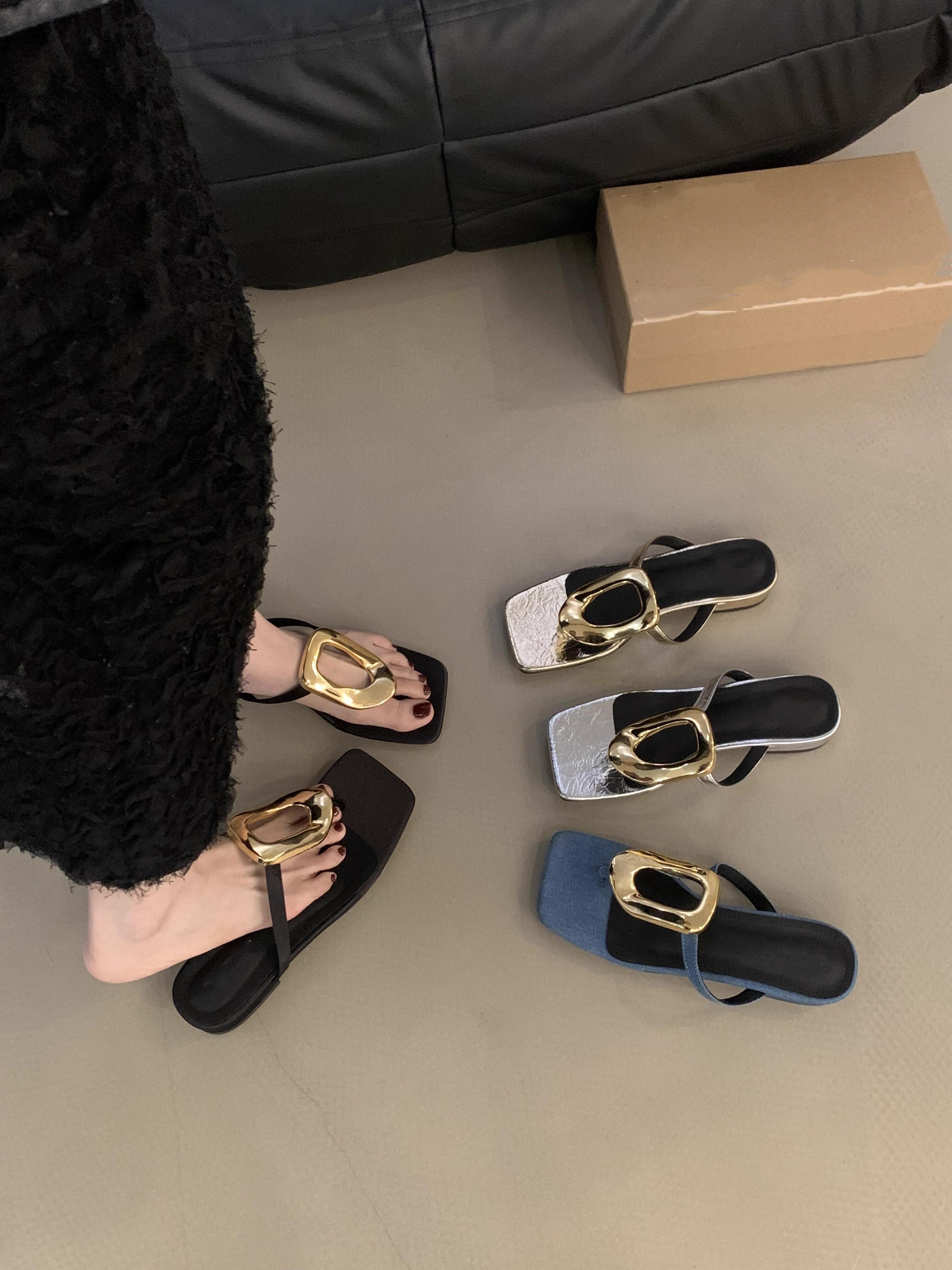 Нишевые шлепанцы с металлической квадратной пряжкой для женской летней верхней одежды. Новые повседневные шлепанцы на плоской подошве 2025 года с квадратным носком.
