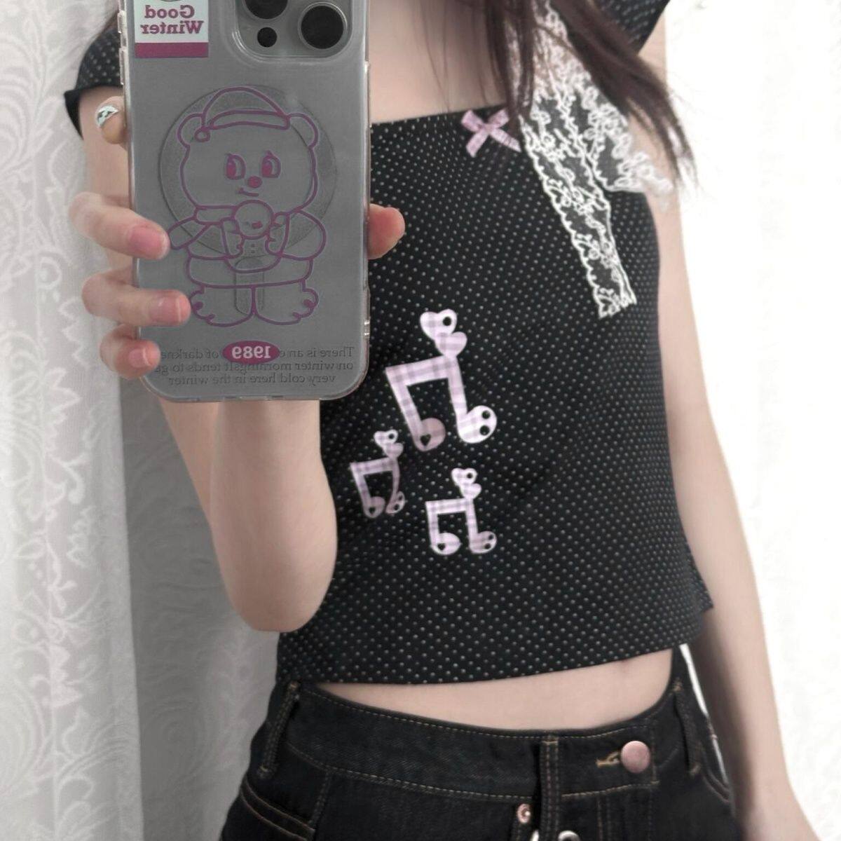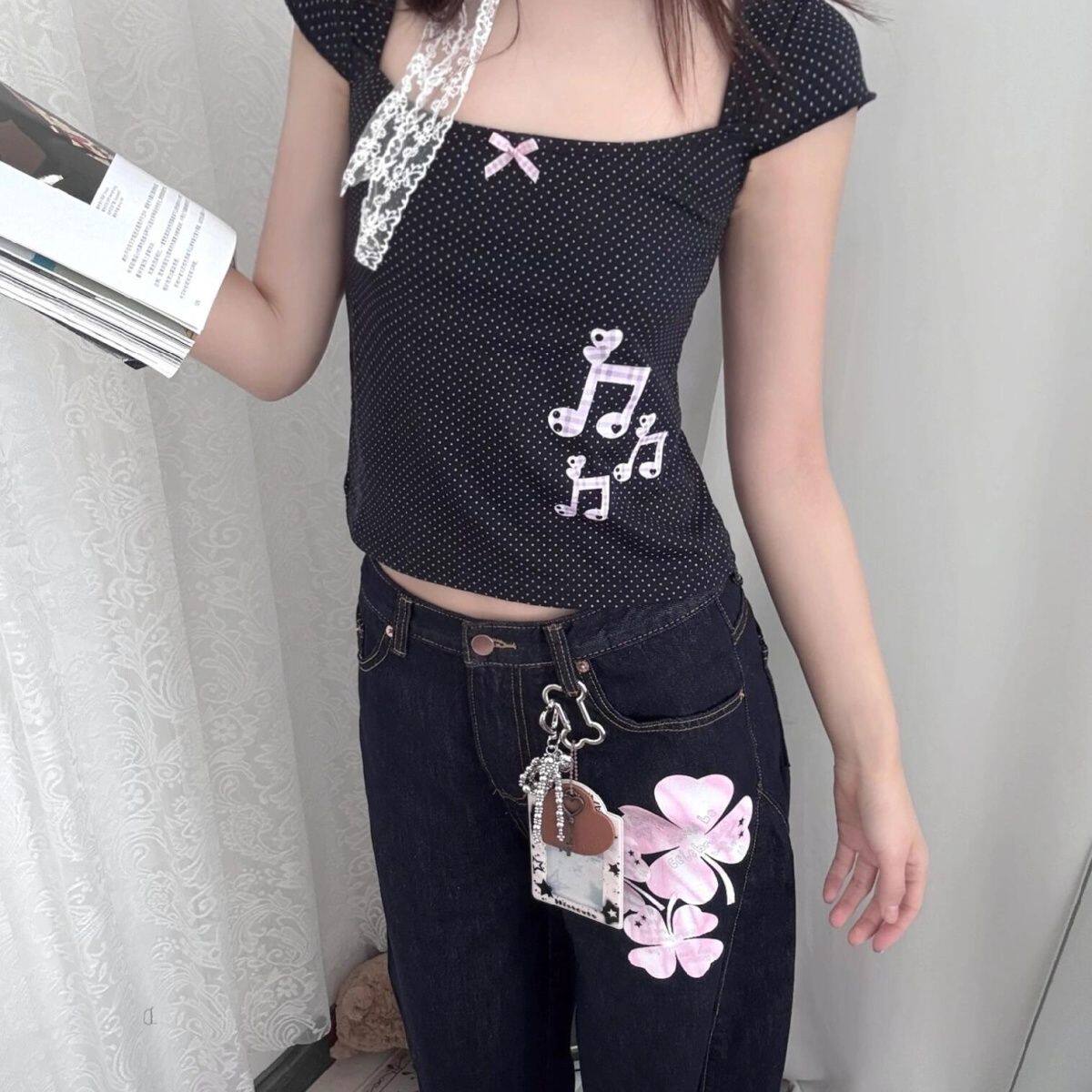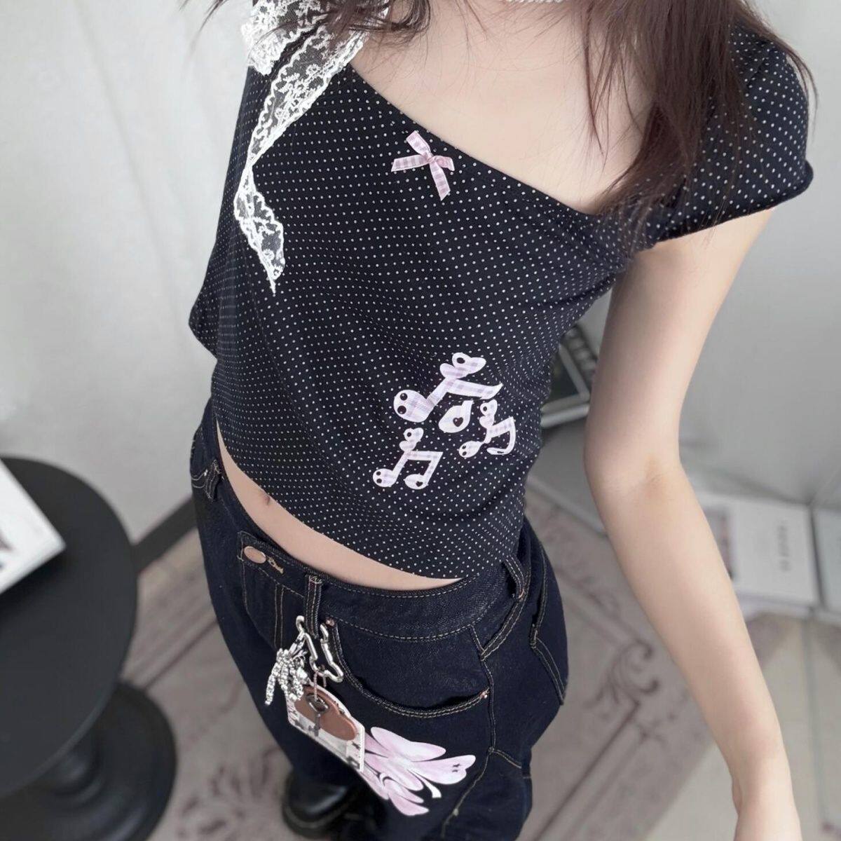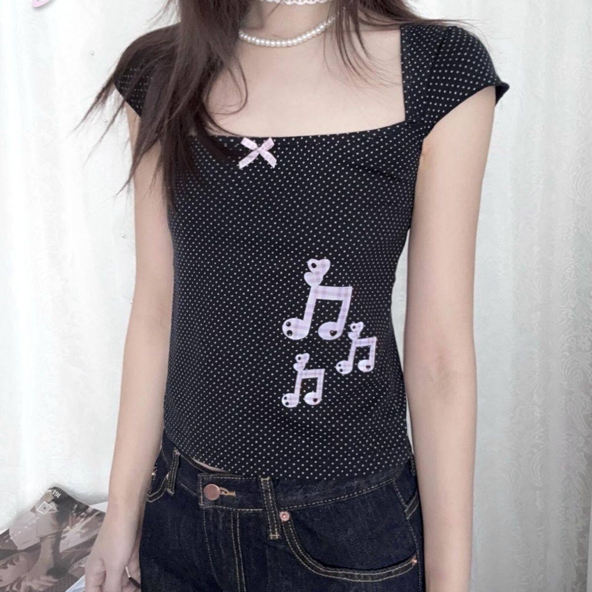 Субкультура японская ретро-в горошек Ноты квадратная шея тысячелетняя горячая девушка Y2K Тень тонкое плечо