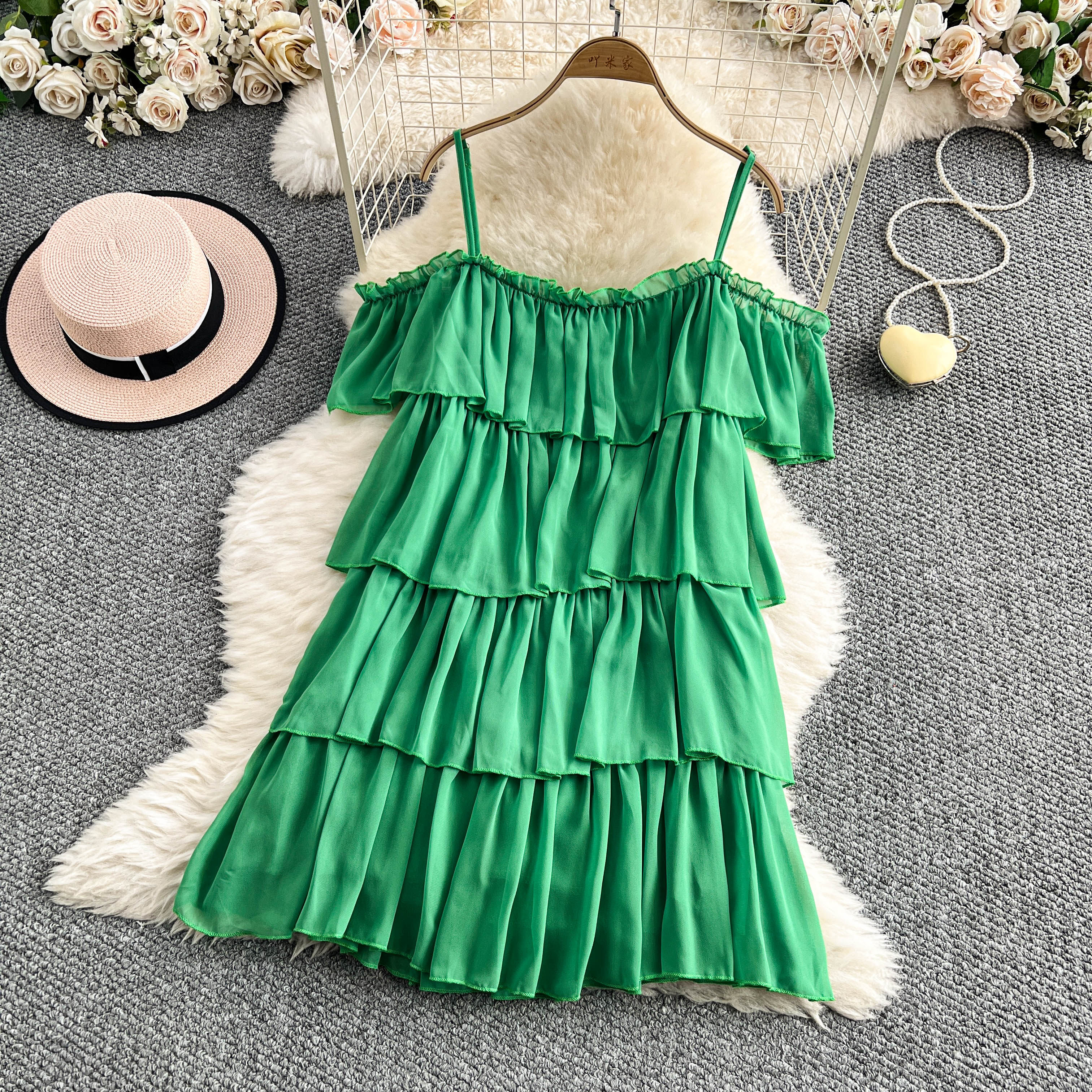 Летнее милое зеленое платье, длинная юбка, эффект подтяжки, открытые плечи, средней длины
