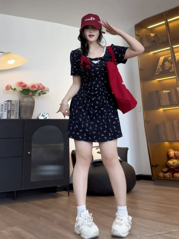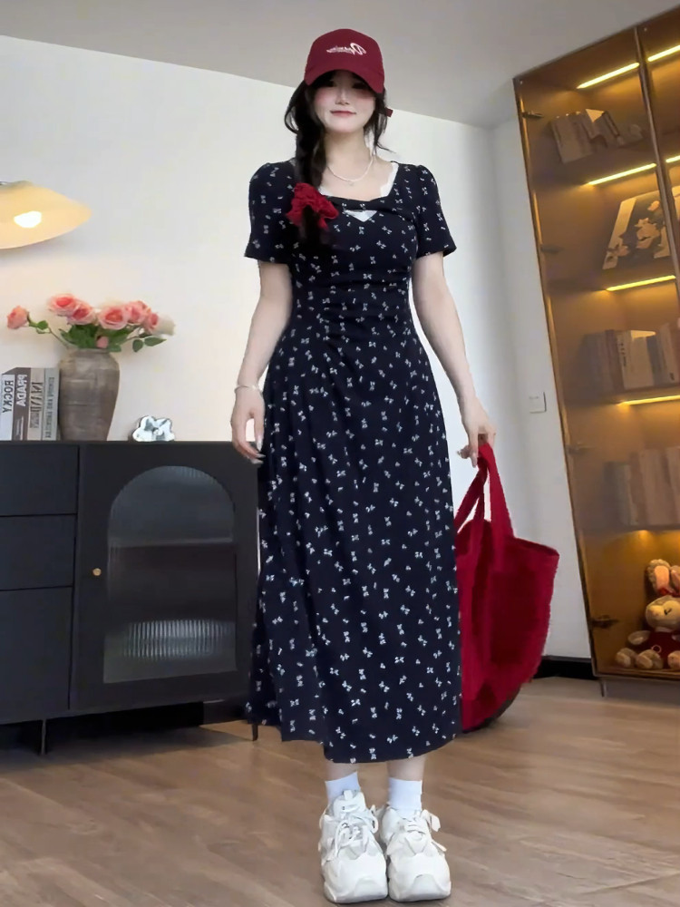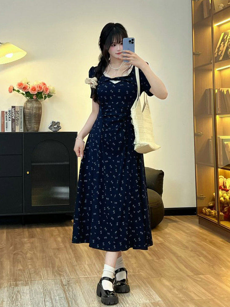 Милое платье, летний приталенный корсет, длинная длинная юбка, большой размер, французский стиль, в цветочек, изысканный стиль, А-силуэт
