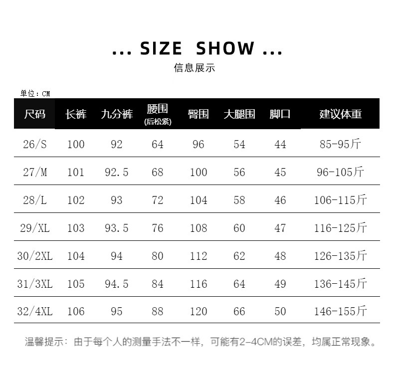 | Размер: | 26/с предложение 85-95 Catties, 27/м предложение 96-105 Catties, 28/L Рекомендуется 106-115 кот, 29/XL Предложение 116-125 Catties, 30/2xl Предложение 126-135 Catties, 31/3xl Предложение 136-145 кот, 32/4xl Предложение 146-155 Catties |
