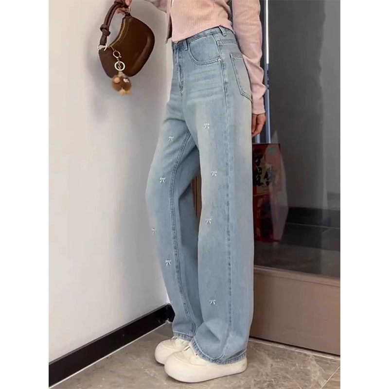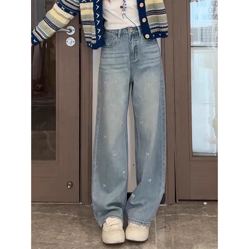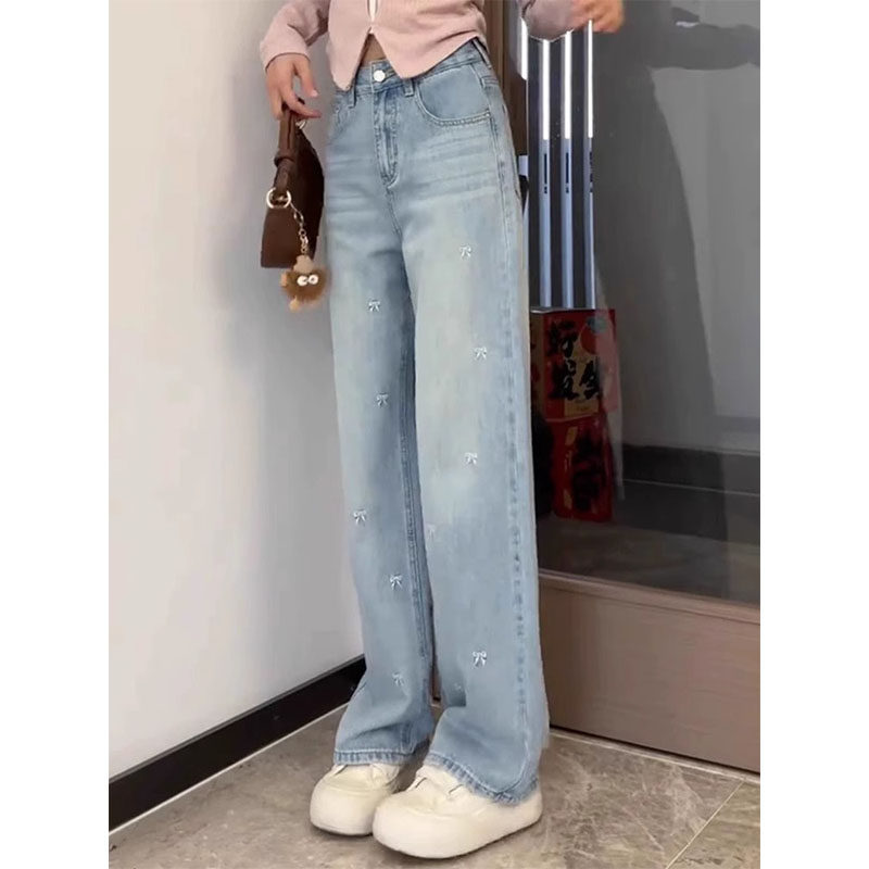 Синие джинсы, приталенные штаны, большой размер, с вышивкой, для формы тела «груша», высокая талия, свободный прямой крой
