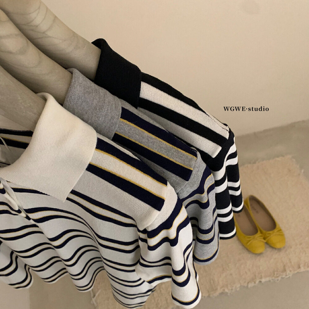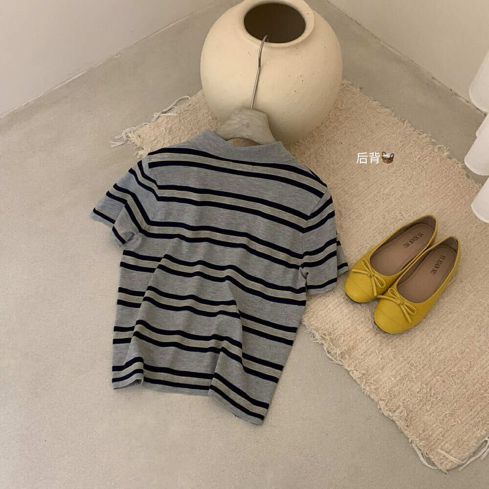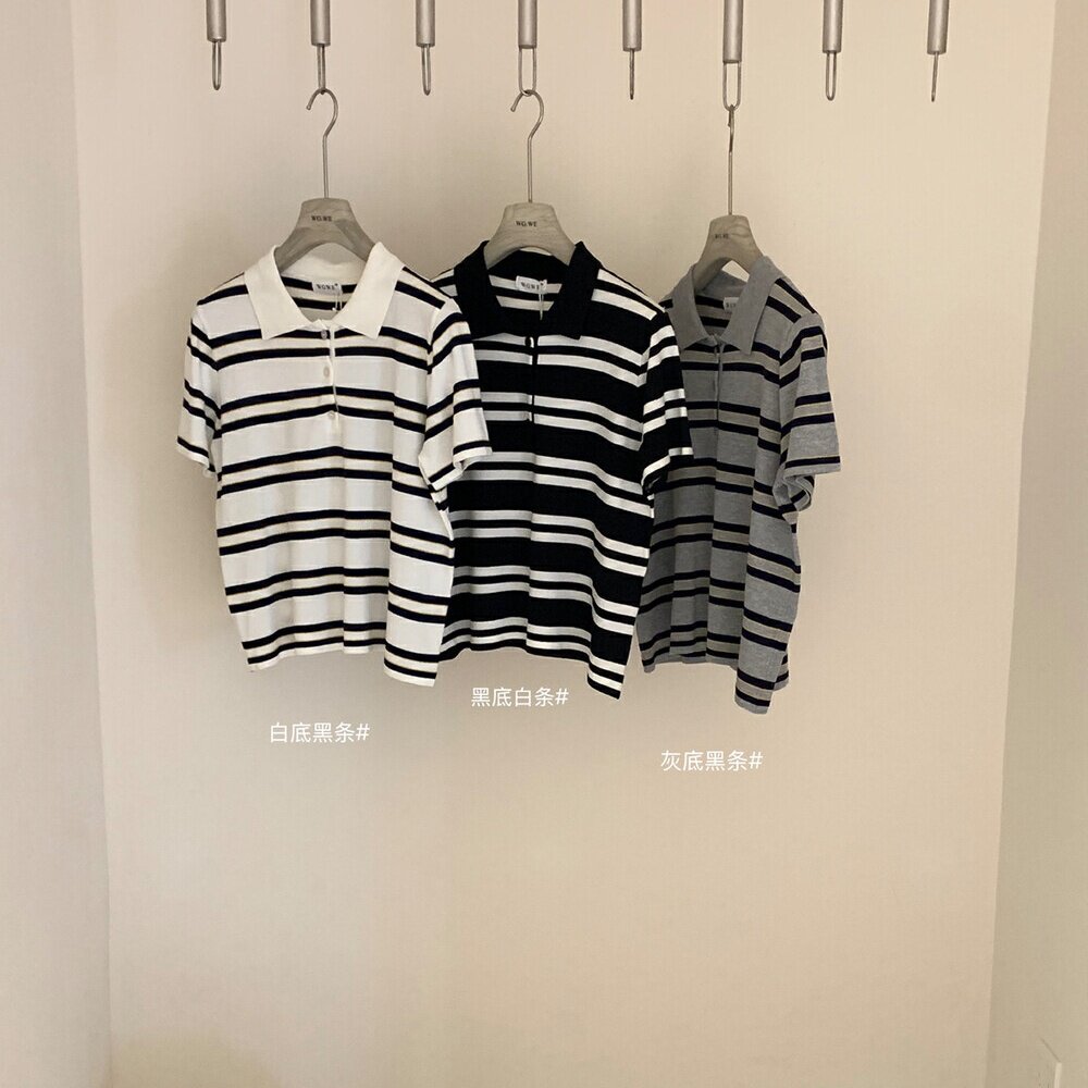 WGWE2025, летняя корейская версия, универсальный тонкий полосатый свитер с лацканами и короткими рукавами для женщин, уменьшающий возраст, универсальный свободный топ, тренд