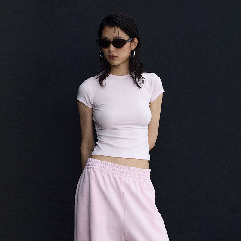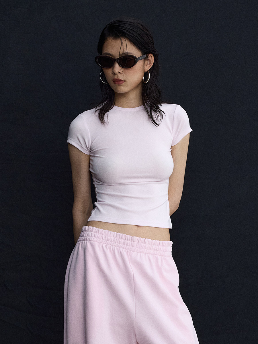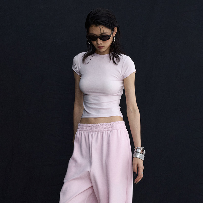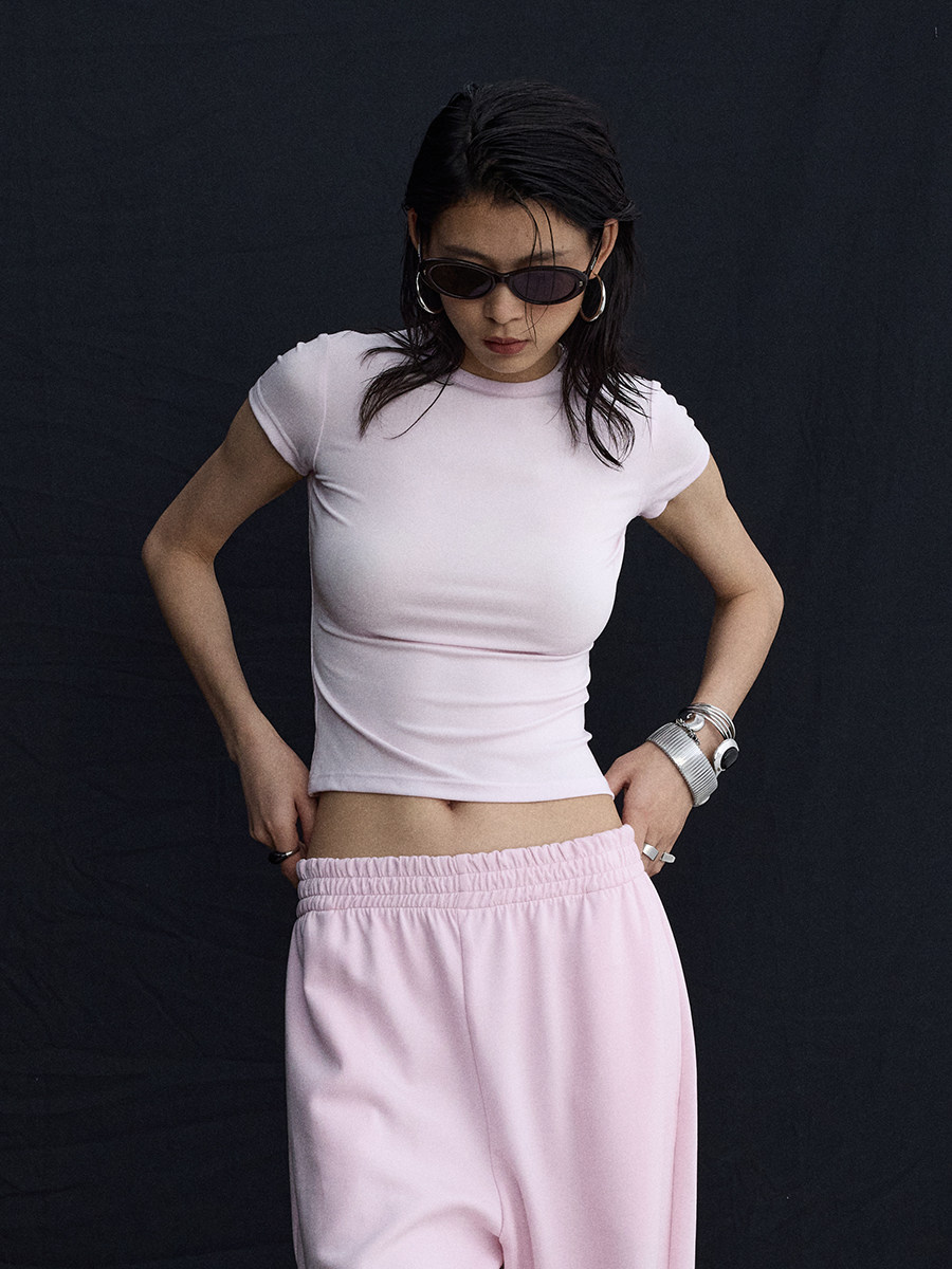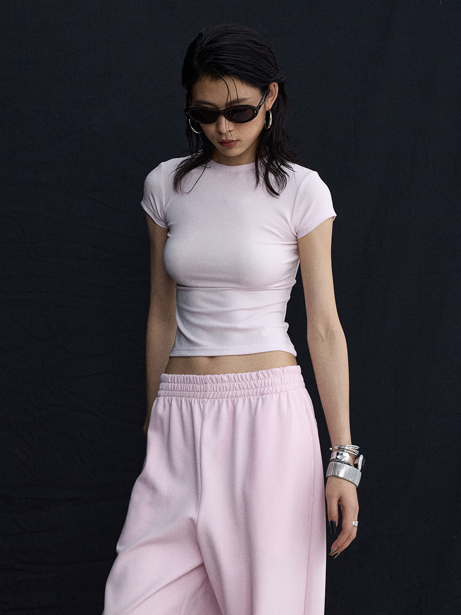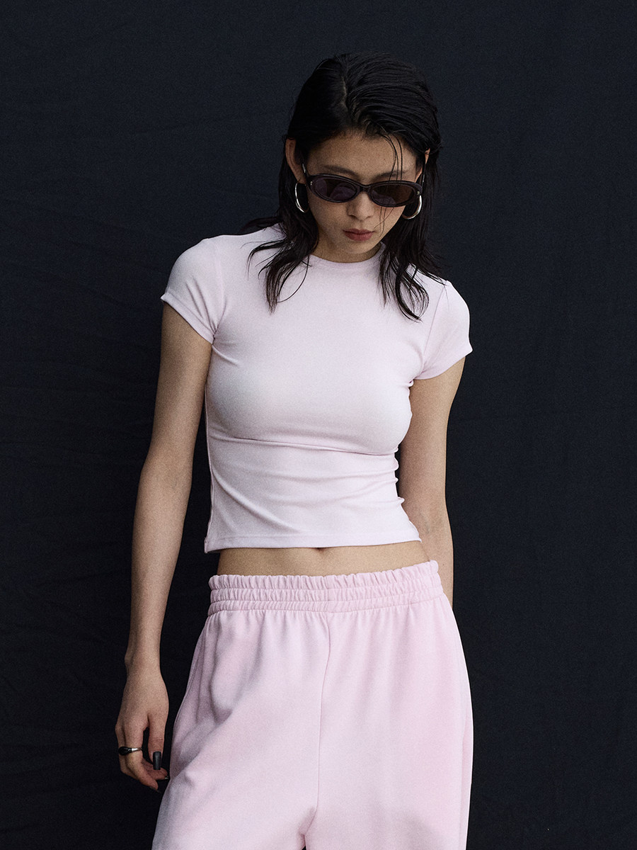 Розовый корсет с круглым воротником, дизайнерская футболка с коротким рукавом, облегающий крой, тренд сезона