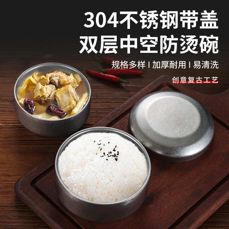 Ретро -ветряная рисовая миска из нержавеющей стали для старой суповой миски, миска Qimchi с крышкой, творческая миска для блюд на гриле мясной блюдо двойной миску