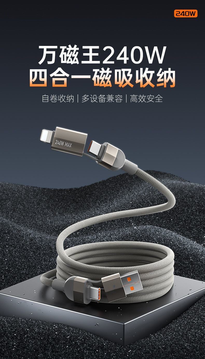 Кабель для передачи данных с магнитным поглощением, 240 Вт, двойной кабель для быстрой зарядки типа C, спиральный кабель «четыре в одном», подходит для Android Универсальный кабель для зарядки мобильных телефонов Pingguo на обоих концах Кабель для зарядки tpyec Кабель для быстрой зарядки PD два на двоих