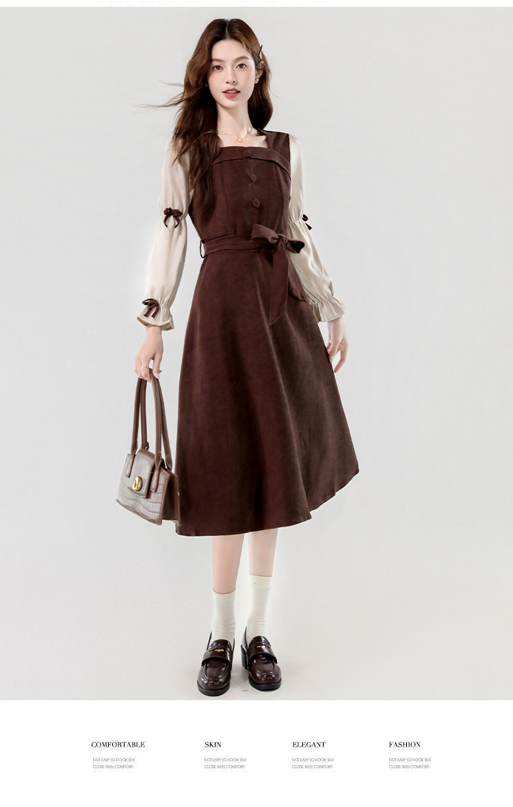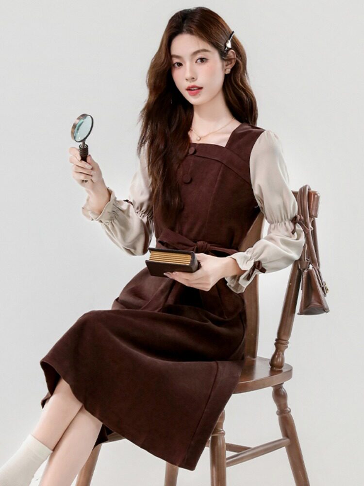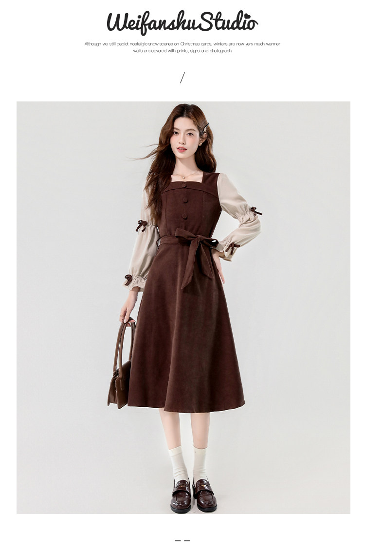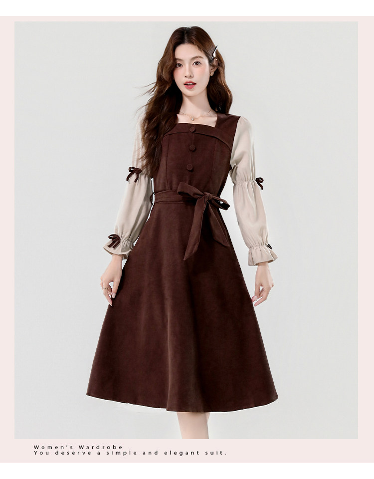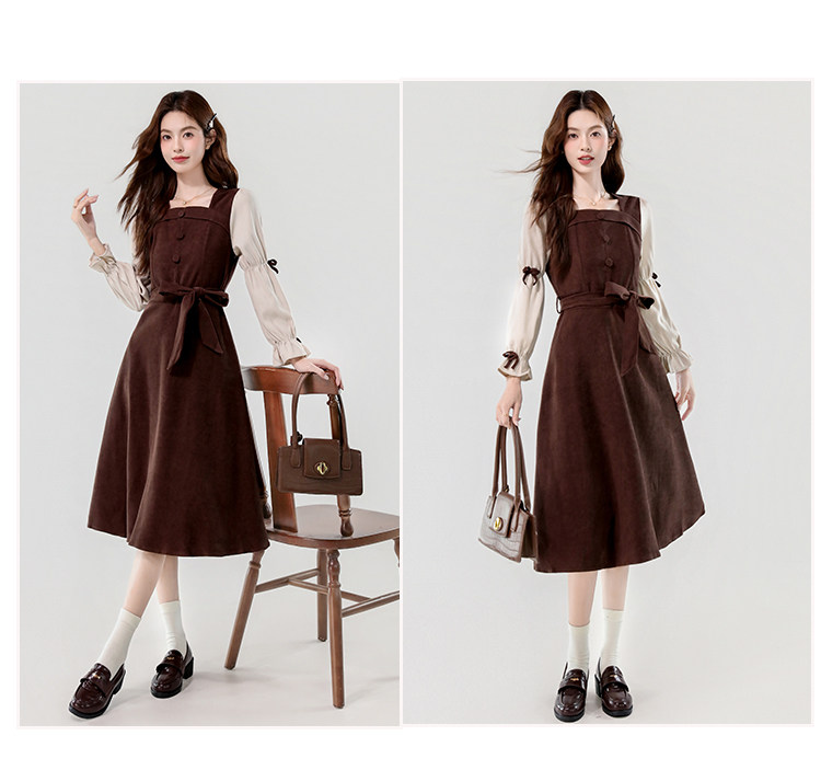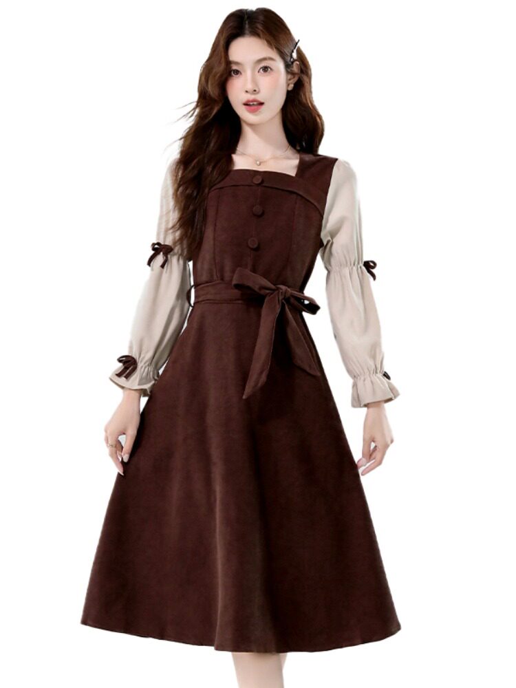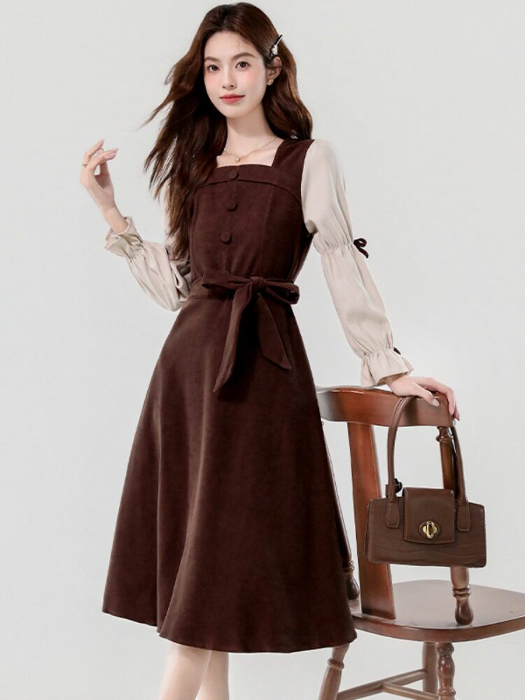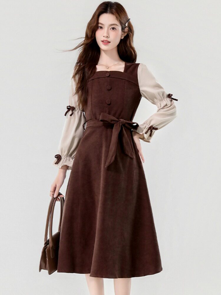 Лонгслив, осеннее платье, вельветовая длинная юбка, квадратный вырез, рукава фонарики