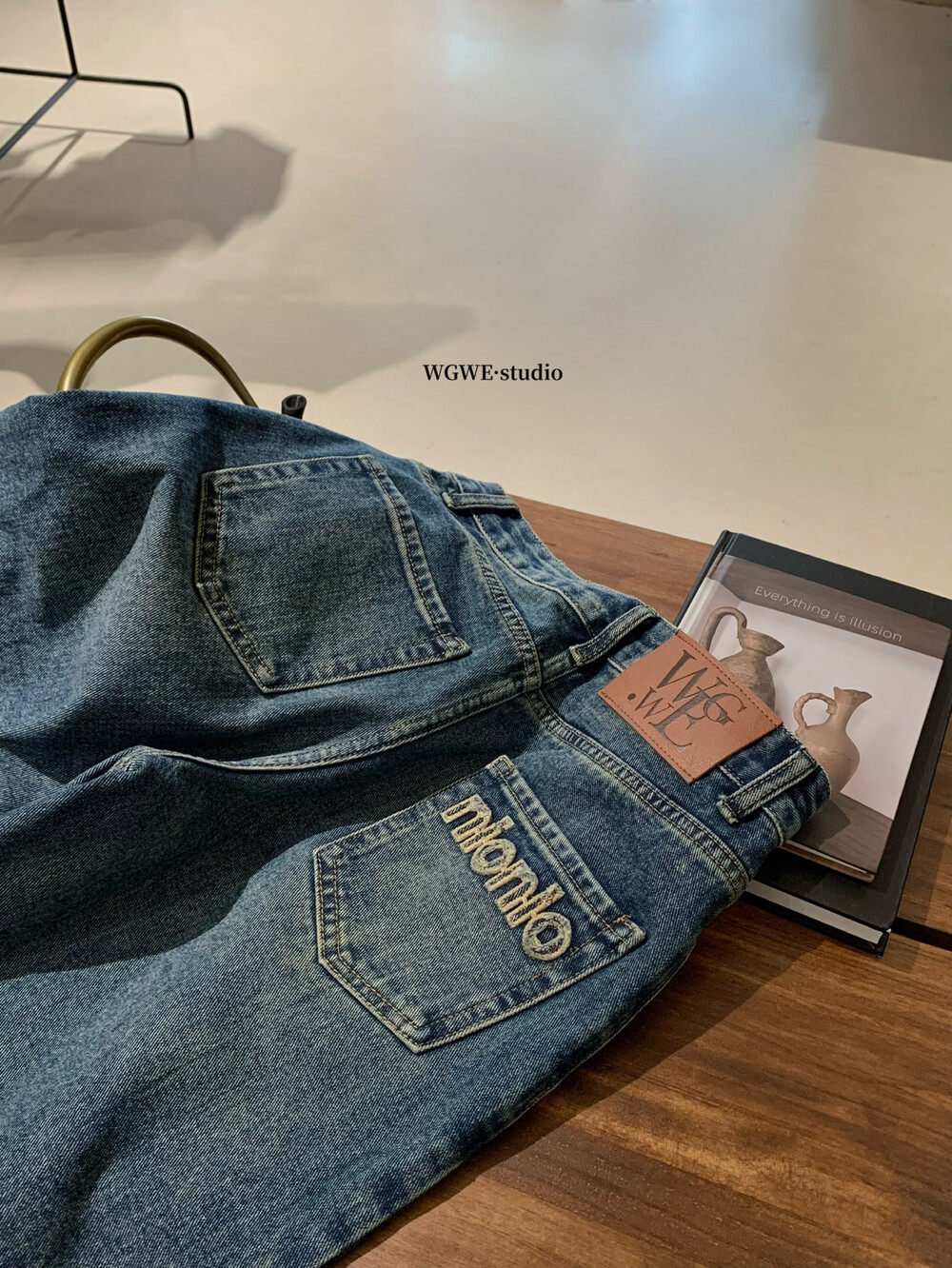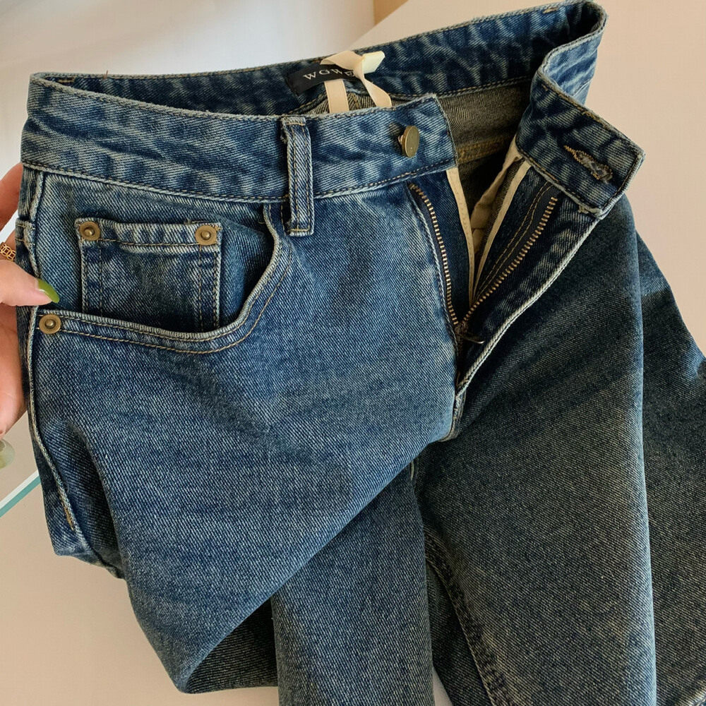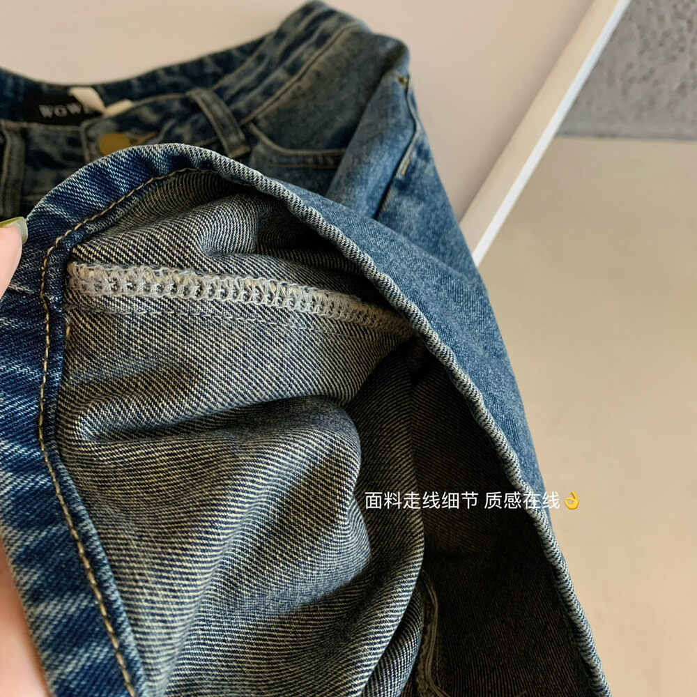 Джинсы, в корейском стиле, с вышивкой, высокая талия, свободный прямой крой