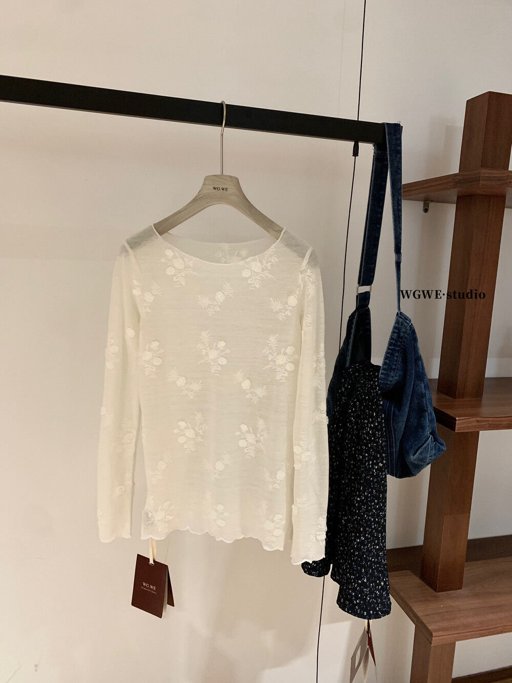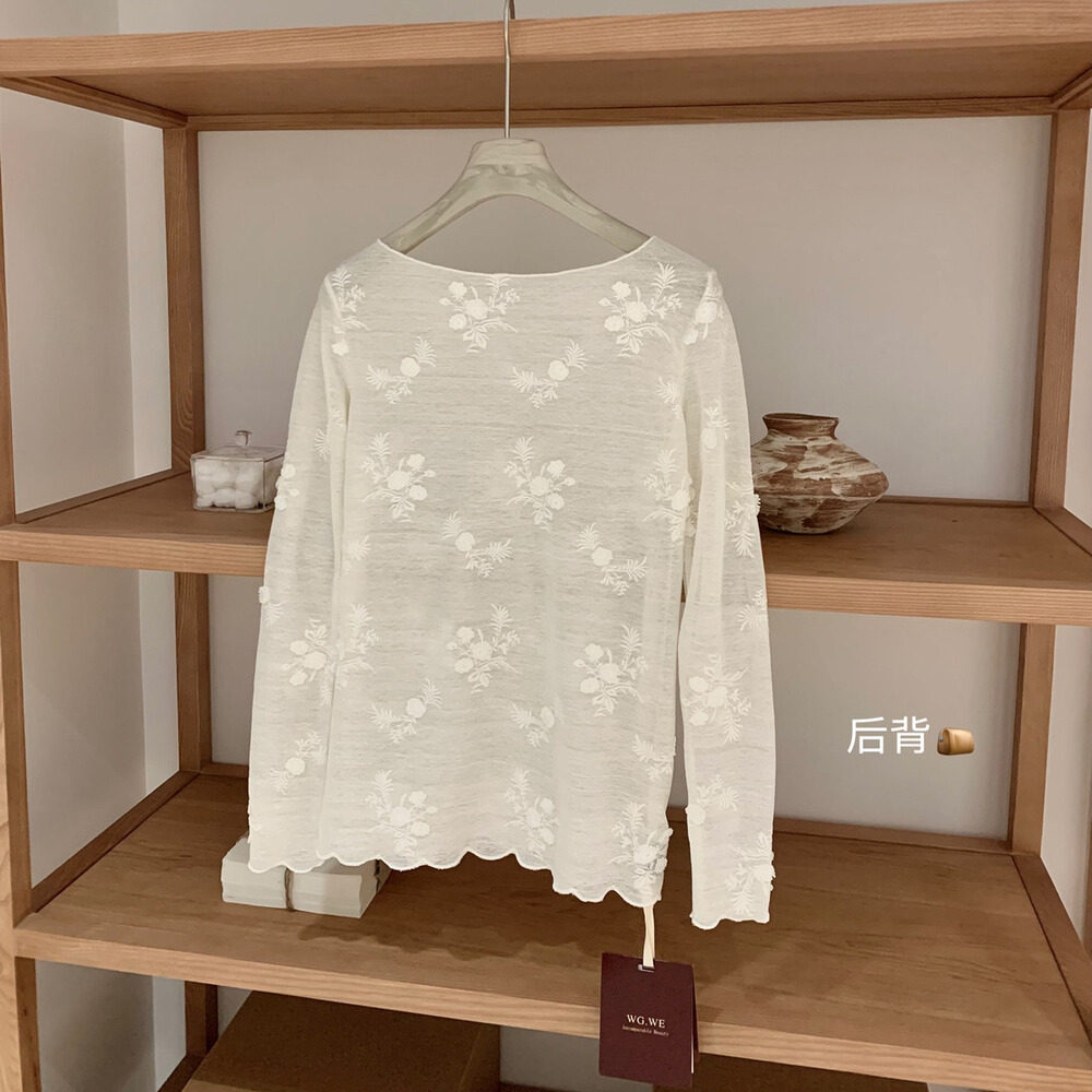 Лонгслив с круглым воротником, кружевная шелковая футболка, в корейском стиле, с вышивкой