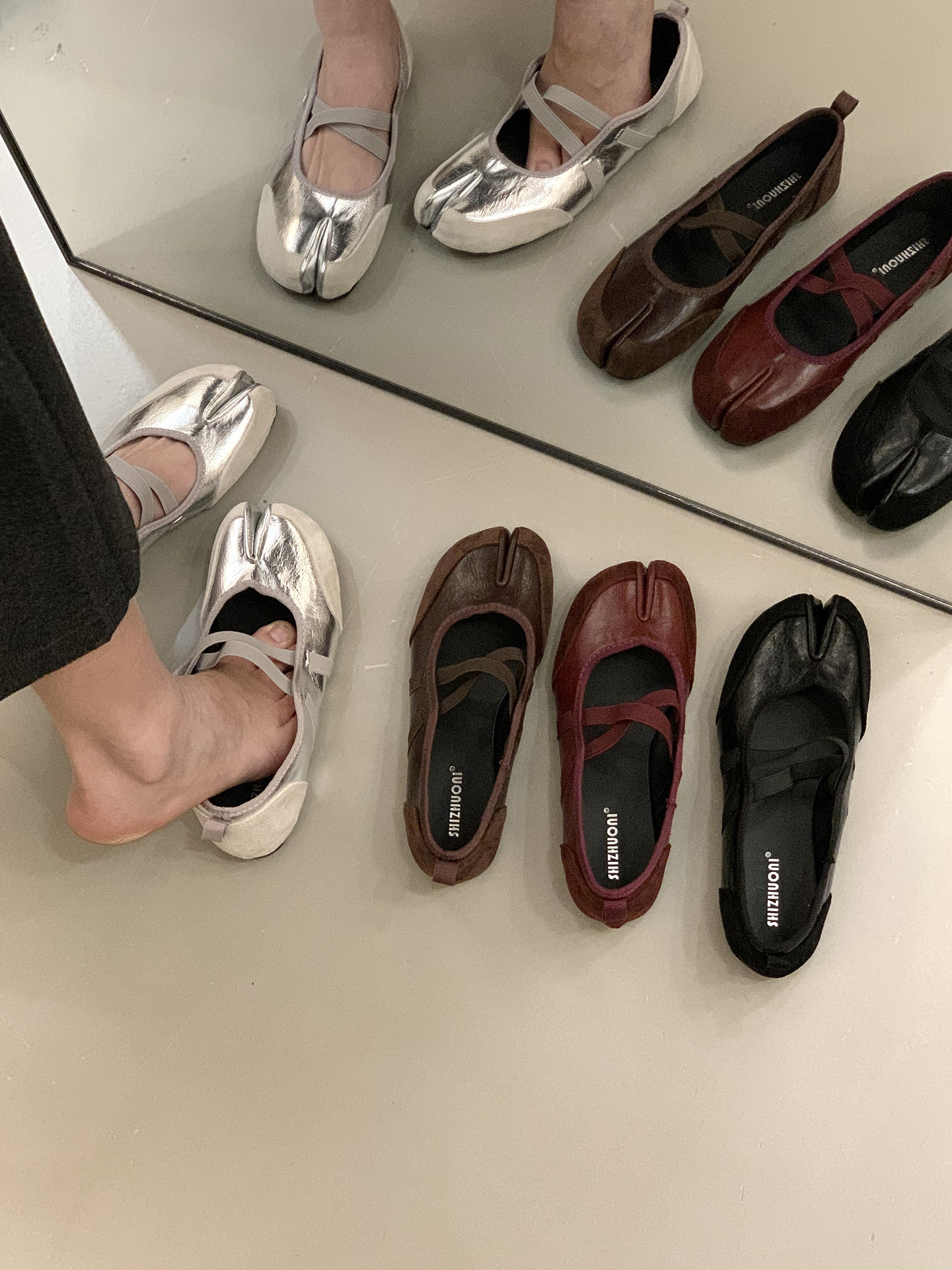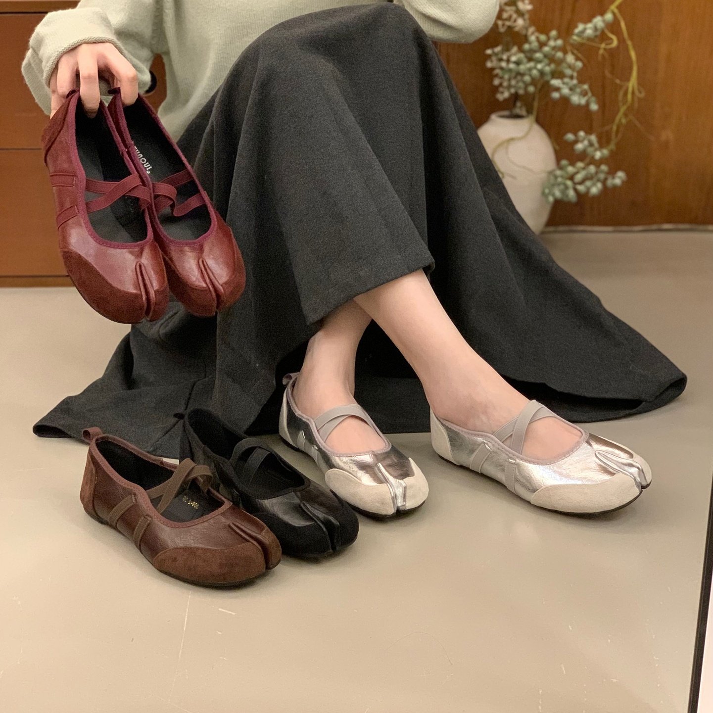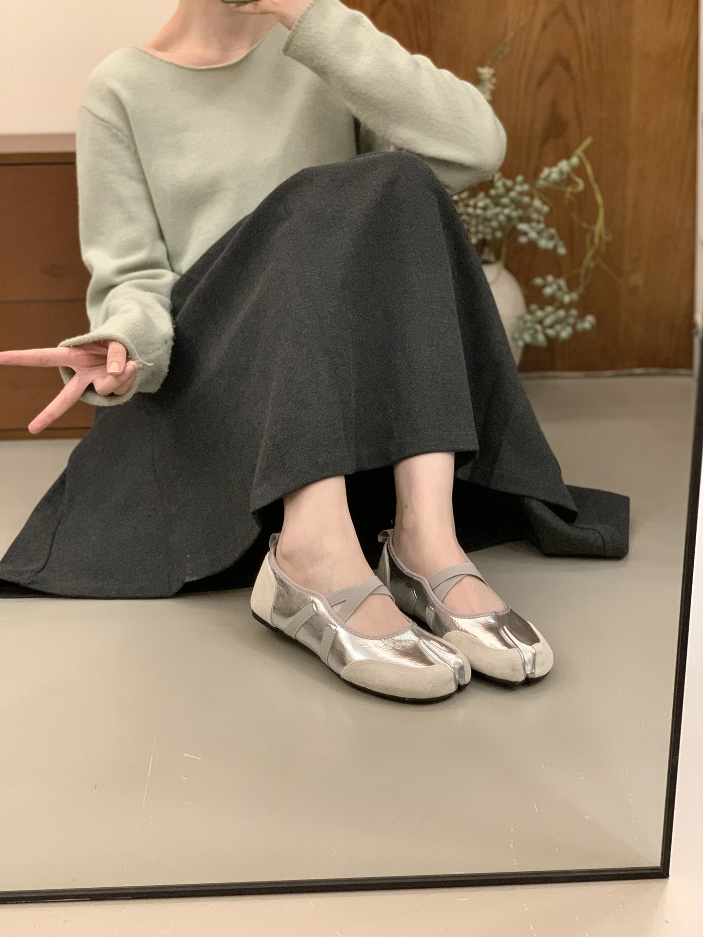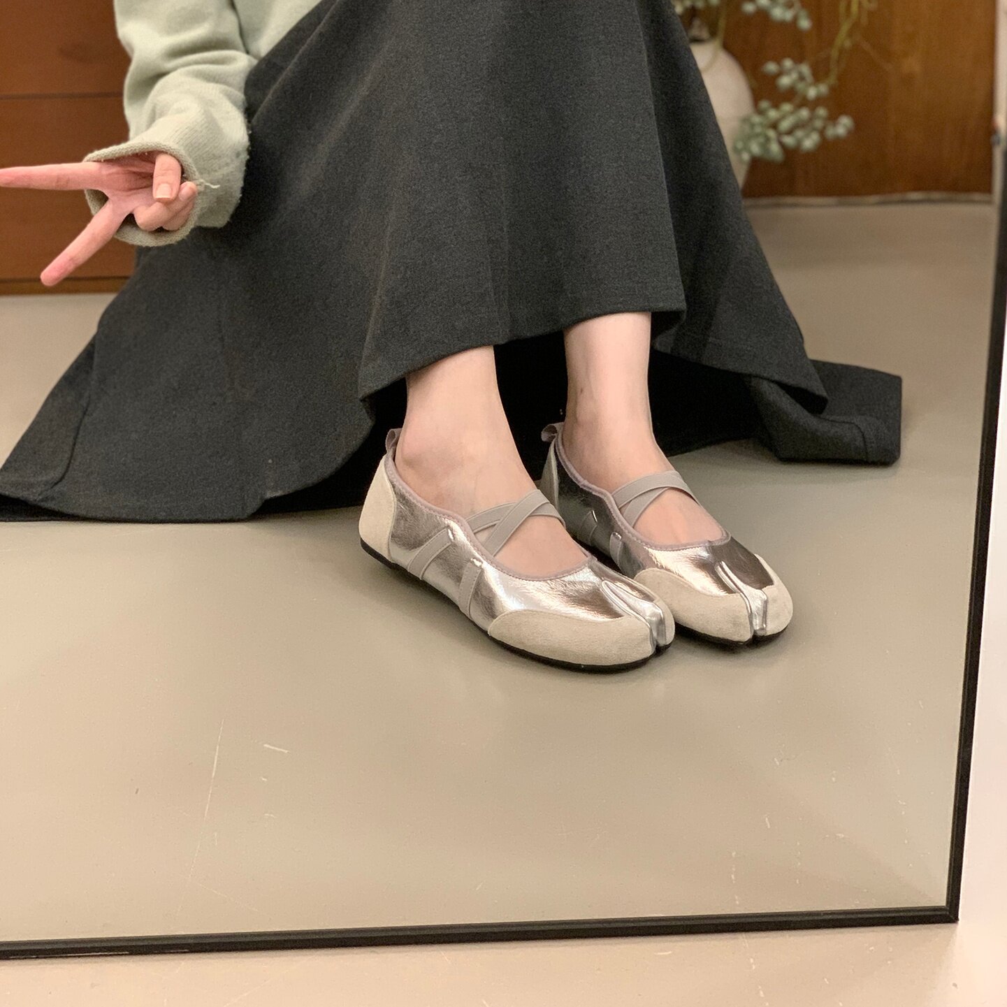 Серебряные туфли Мэри Джейн на плоской подошве с раздвоенным носком, женская обувь, новинка 2025 года, балетные туфли с перекрестными ремешками, подковообразные туфли свиньи