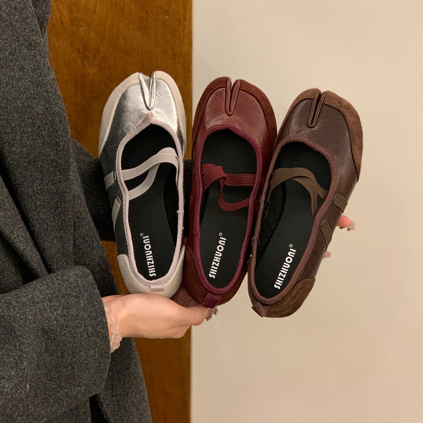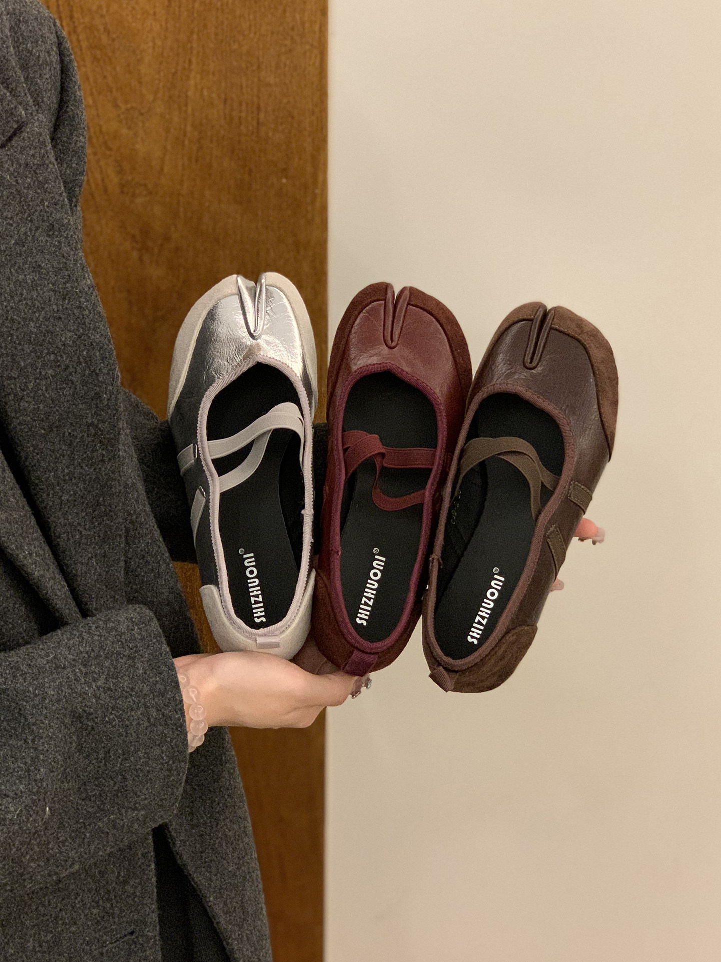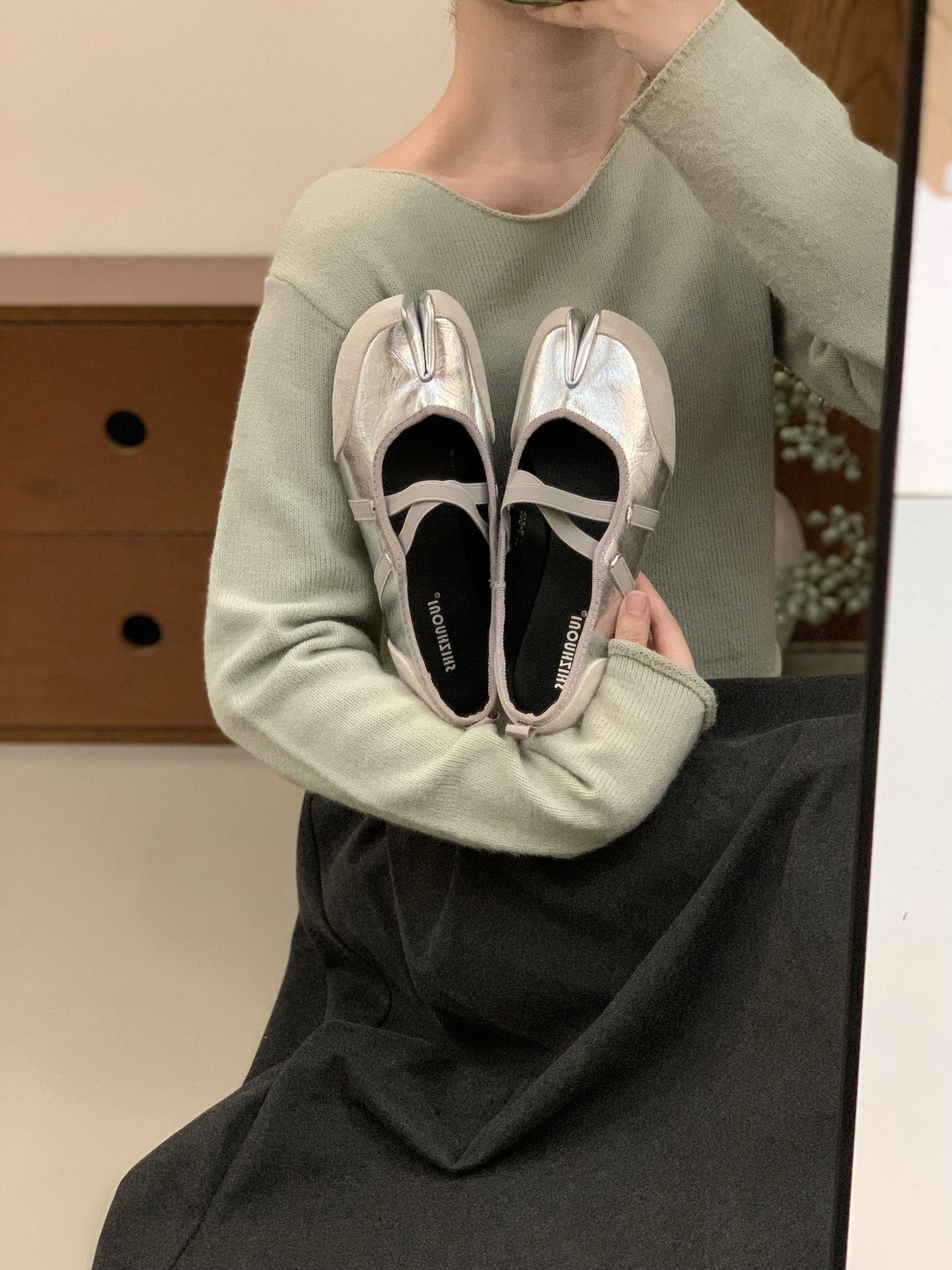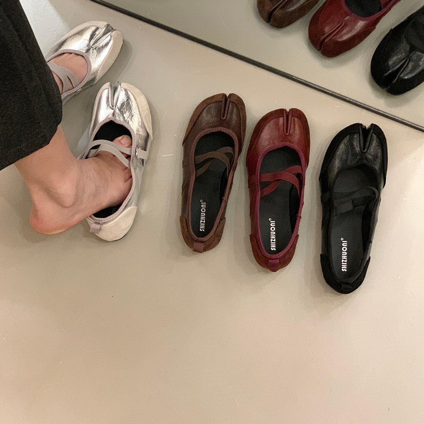 Серебряные туфли Мэри Джейн на плоской подошве с раздвоенным носком, женская обувь, новинка 2025 года, балетные туфли с перекрестными ремешками, подковообразные туфли свиньи