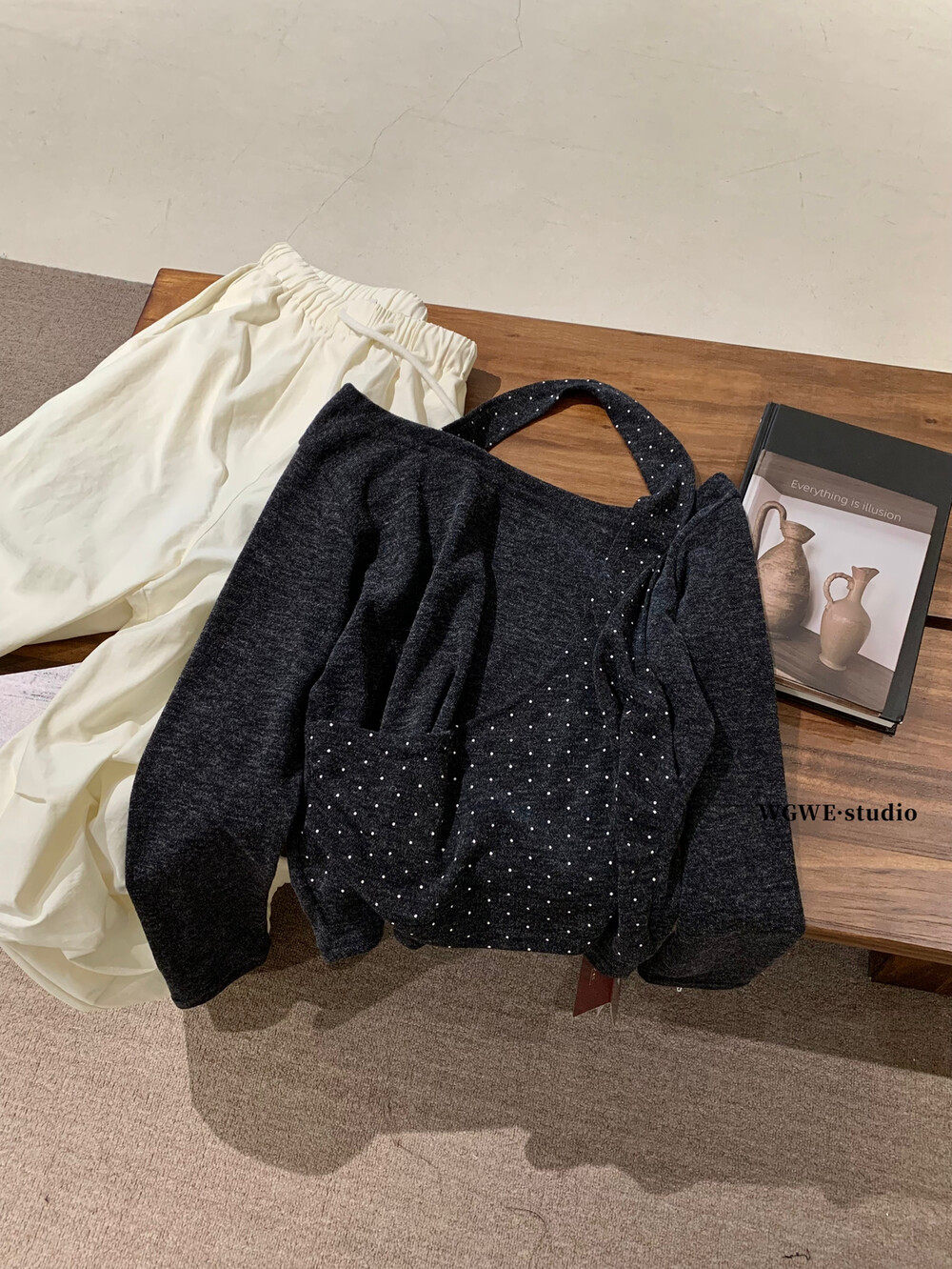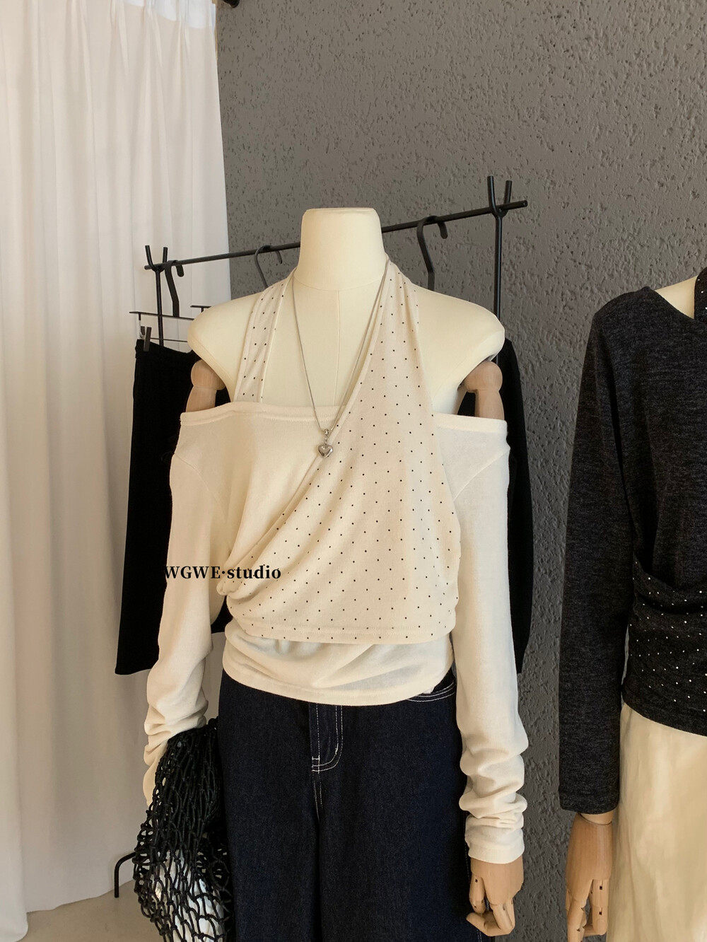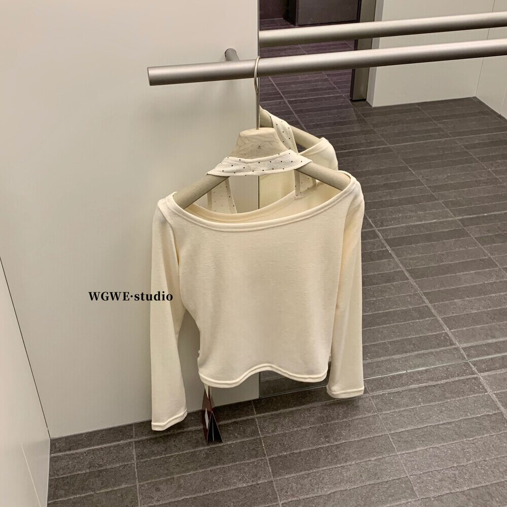WGWE2025 осень и зима корейская версия универсальная утягивающая футболка в горошек из двух частей с воротником-халтер и открытыми плечами, милая красотка, футболка с длинными рукавами