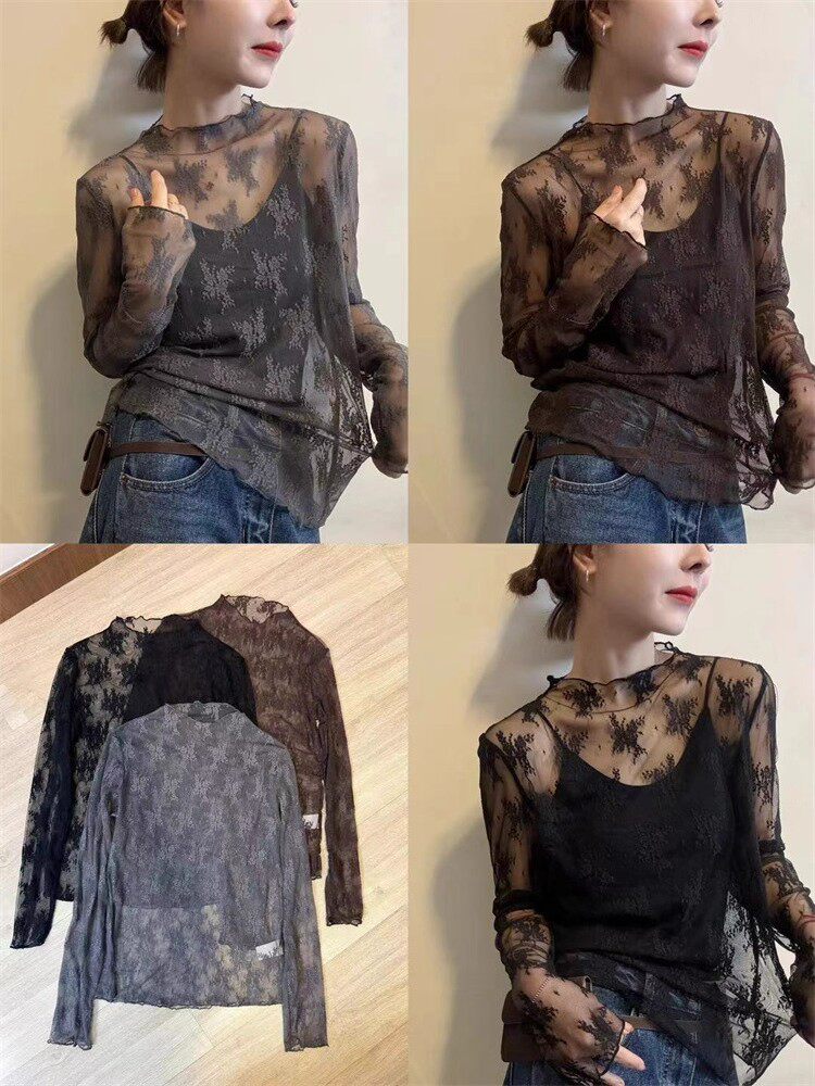 Кружевной осенний дизайнерский тонкий лонгслив, французский стиль, высокий воротник